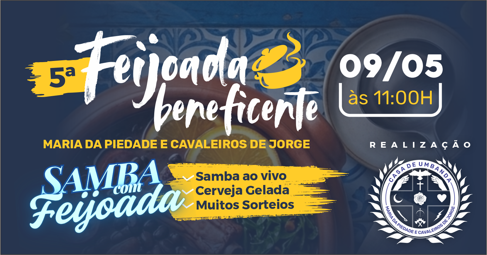 Vem aí a nossa 5ª Feijoada Beneficente, organizada pela Casa de Umbanda Maria da Piedade e Cavaleiros de Jorge. Um dia de muita alegria, axé e aquele samba de primeira que a gente tanto ama!