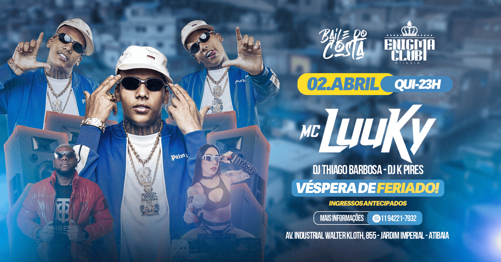 AERONIGHTS REMEMBER DIA 11 de ABRIL de 2026 Início às 20hs até as 2hs Local: Estação Atibaia - Atibaia/SP Prepare-se para um evento inesquecível! No dia 11 de abril, a histórica Estação Atibaia será palco de uma grande festa, reunindo várias bandas incríveis, luzes vibrantes e um clima contagiante de alegria. Com início às 20Hs, a festa promete agradar a todos os públicos. Serão cinco bandas, com artistas talentosos que trarão estilos para todos os gostos, desde rock e pop e música eletrônica. Além da música, você terá um espaço totalmente estruturado para eventos: Som e Iluminação de alta qualidade, criando uma experiência sensorial única; Praça de Alimentação com deliciosas opções de comida e bebida, food trucks e barracas locais que oferecem desde pratos tradicionais até opções gourmet. Gente bonita e animação garantida! A oportunidade perfeita para reencontrar amigos, conhecer pessoas novas e se divertir. BANDAS: AEROGUNS COVER \ PEARL JAM COVER \ OAZ \ VOLLCANO \ AVISO PRÉVIO \* DJ RONALDO LIMA Os ingressos já estão à venda e podem ser adquiridos: INGRESSOS: PISTA (Individual) 1º LOTE - R$50,00/cada MESA (Para até quatro pessoas) - R$280,00 ( Optando por este ingresso por gentileza após a compra, entre em contato conosco pelo whatsapp (11)94732-7785 e/ou 97268-3594 para passarmos o mapa de mesas disponível no momento para que você escolha a de sua preferência). Atenção todas as modalidades de ingresso (pista e/ou mesa) são limitadas então não perca a oportunidade e garanta seu ingresso! Observação: Ao chegar no local do evento, você deverá validar seu ingresso no guichê exclusivo para os compradores virtuais, não esqueça de levar seu comprovante e documento com foto ! ;) Os estacionamentos fechados ficarão abertos a partir das 19h, porém o acesso à área interna da festa somente a partir das 20h! \\\O Estacionamento é cobrado já na entrada do recinto, pedimos que facilite o troco! O valor será divulgado em nossas redes sociais na semana da festa, então não deixe de seguir nossas páginas de facebook e instagram ;) \\\ Atenção: O evento seguirá todas as medidas de segurança permitidas para garantir uma experiência tranquila e agradável para todos. Esperamos por você! Acompanhe em tempo real nossas publicações através de nosso facebook https://www.facebook.com/aeronights e instagram aeronightsoficial Conheça um pouco mais da nossa história: O Aeronights foi uma casa noturna que funcionou em Atibaia/SP no final da década de 80 e início de 90. Ficava localizado no Aeroporto e era conhecido na Época como o Pub de Atibaia. As Sextas feiras eram o ponto alto da Casa onde recebia o maior número de público da Região, e depois de muitos anos estamos lançando o REMEMBER dessa Casa que deixou saudades não só na cidade como na região. Para informações e/ou compras de maiores mesas contate-nos pelo whatsapp (11)94732-7785 e/ou 97268-3594 e receba todas as nossas atualizações e novidades da festa! Teremos grande prazer em atendê-lo ;)