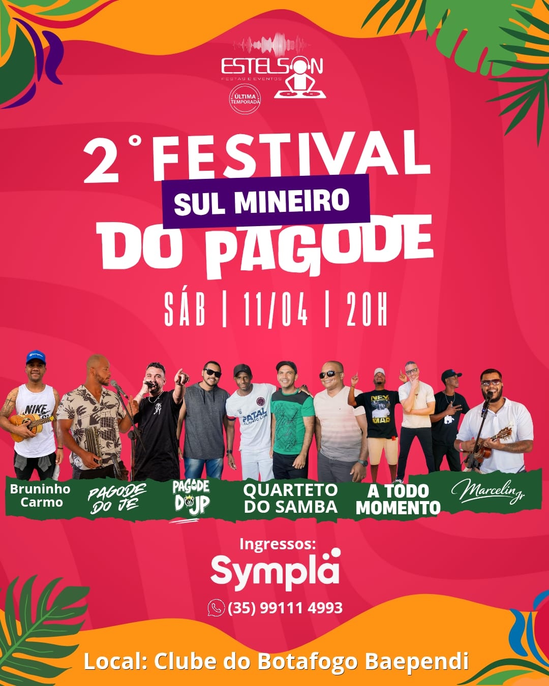 Vem aí o 2º Festival Sul Mineiro do Pagode, uma noite especial reunindo grandes nomes do pagode da região! Prepare-se para muita música, alegria e aquela energia que só o pagode tem.
