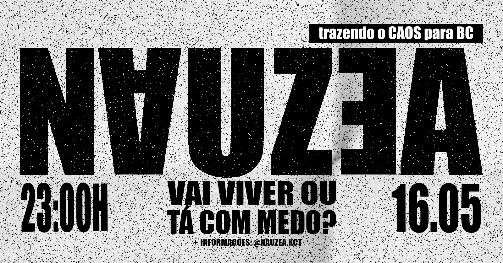 Com discotecagem de JFRSON NOIR, a NAUZEA fará sua grande noite de estreia dia 16/05 e trará toda a potência em uma noite de rock que BC nunca viu! Prepare-se para uma noite com muito rock alternativo, pop punk, anos 80, post-punk, punk, nu metal, metalcore, new wave e ainda teremos RODADA DE TEQUILA GRÁTIS 00h!