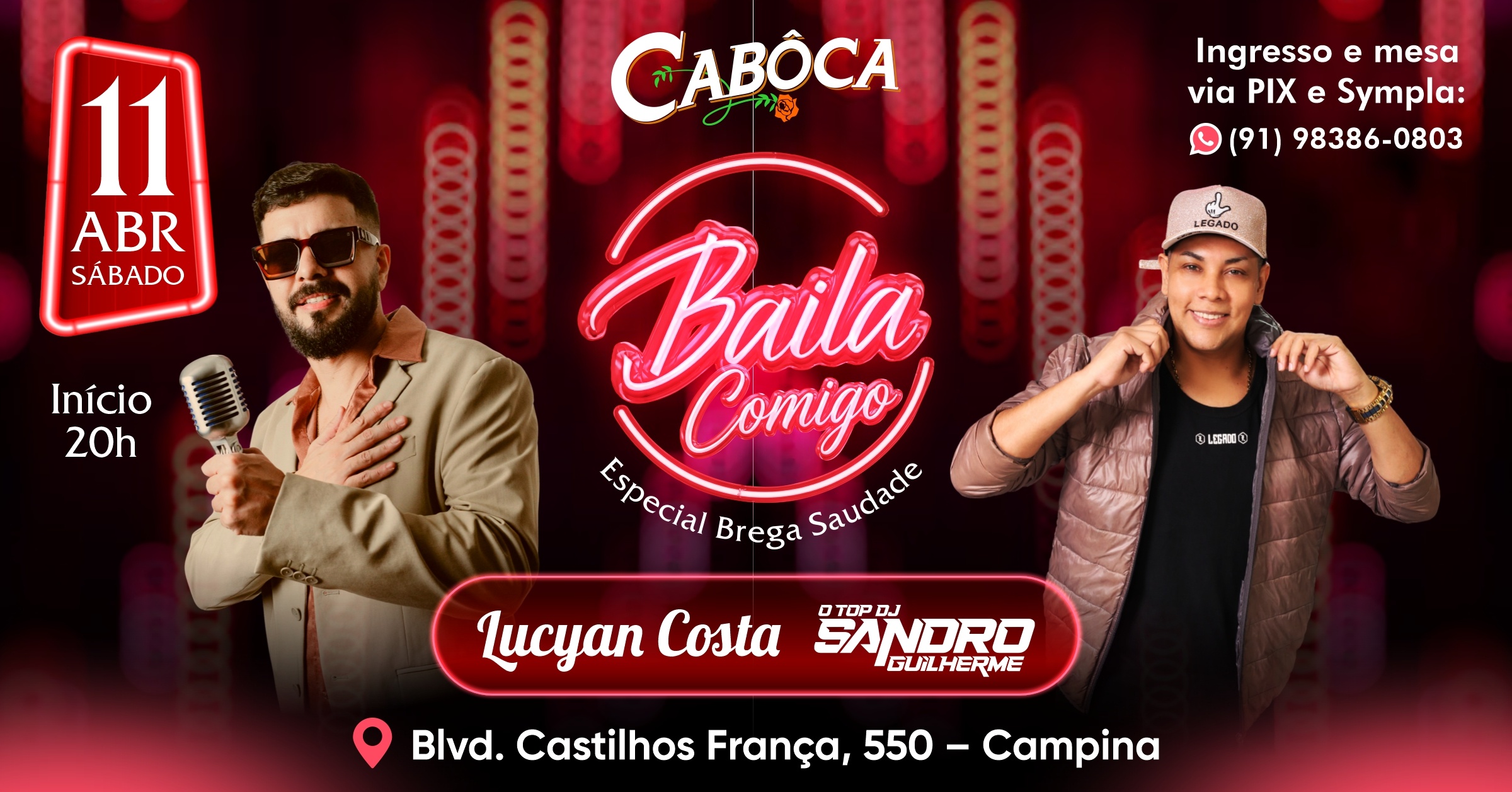 No dia 11 de abril, a Cabôca vira palco de emoção com o Baila Comigo – Especial Brega Saudade. Aquela vibe que arrepia, música que bate no peito e não deixa ninguém parado.