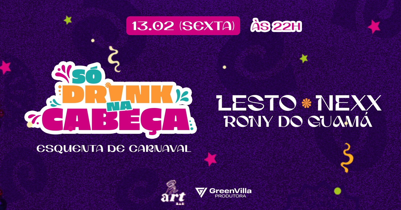 A festa Só Drink na Cabeça chega pra dar o start no Carnaval com os Dj's Lesto, Nexx e Rony do Guamá tocando muito axé, pagodão baiano, funk e pop.