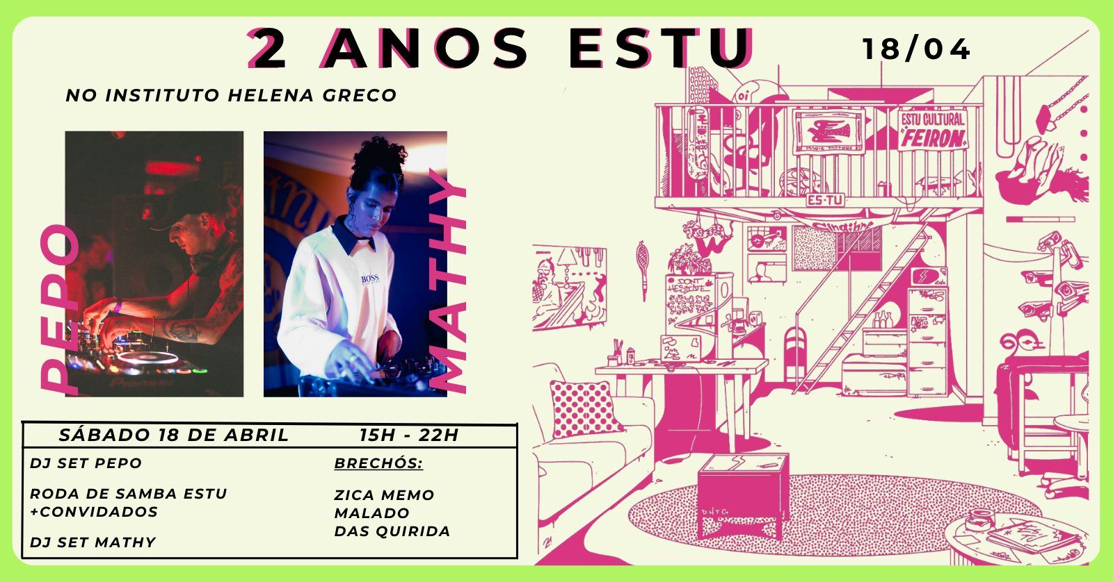 Comemoração de 2 anos do Estu cultural com Roda de Samba do Estu, Djs PEPO e MATHY, de 15h as 22h do dia 18 de Abril, no INSTITUTO HELENA GRECO.