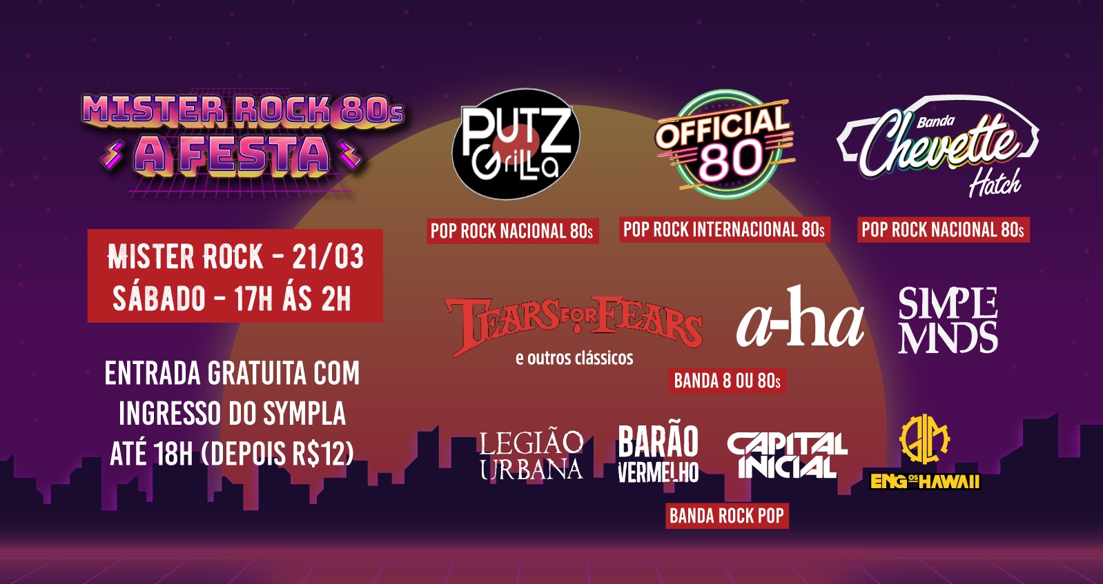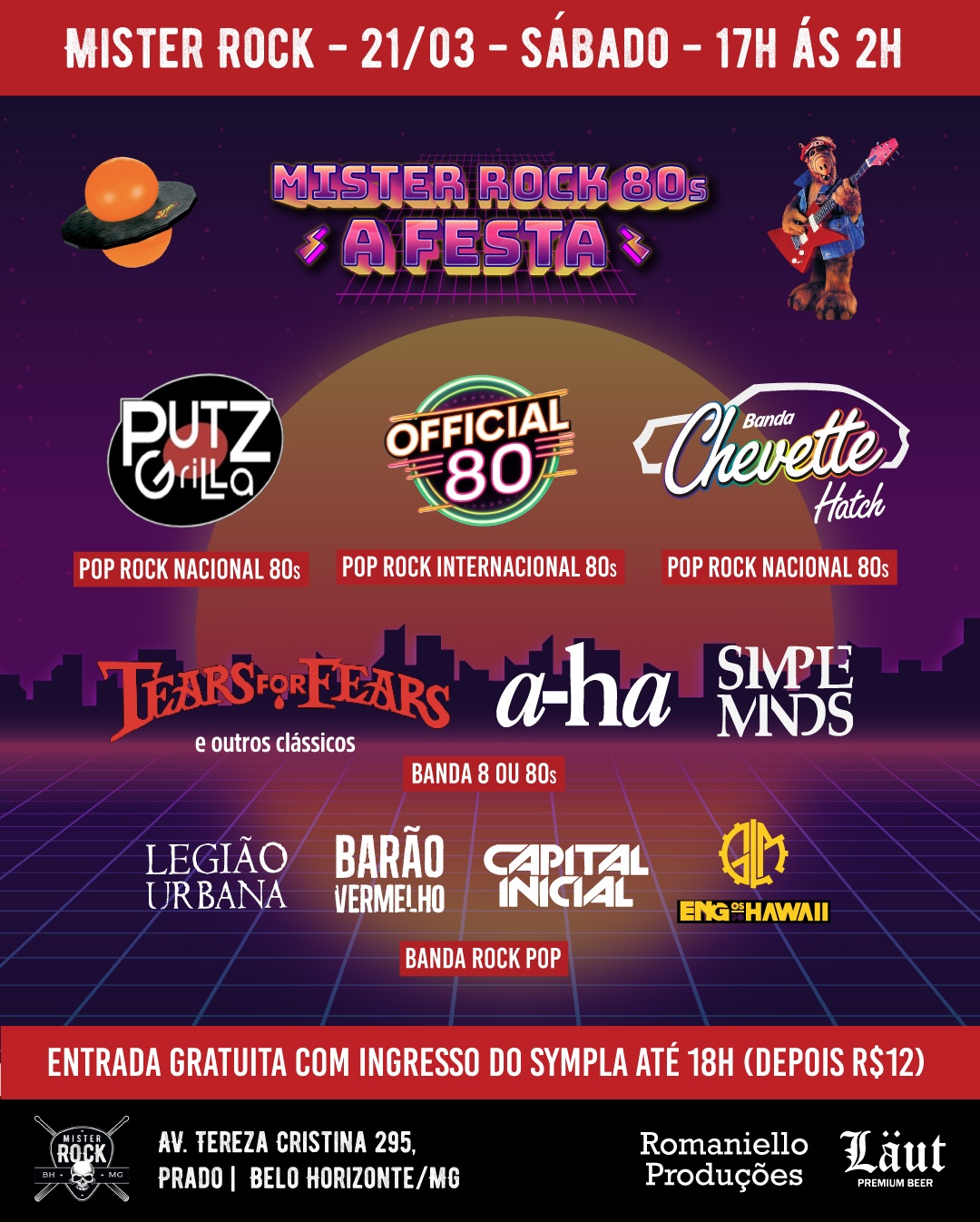 Festa anos 80s nesse sábado com as bandas Putz Grilla (Pop Rock Nacional), Chevette Hatch (Pop Rock Nacional), Official 80 (Pop Rock Internacional 80s), 8 ou 80s (Tears for Fears, A-ha, Simple Minds e outros clássicos) e Rockpop (Legião Urbana, Engenheiros do Hawaii, Barão Vermelho, Capital Inicial).