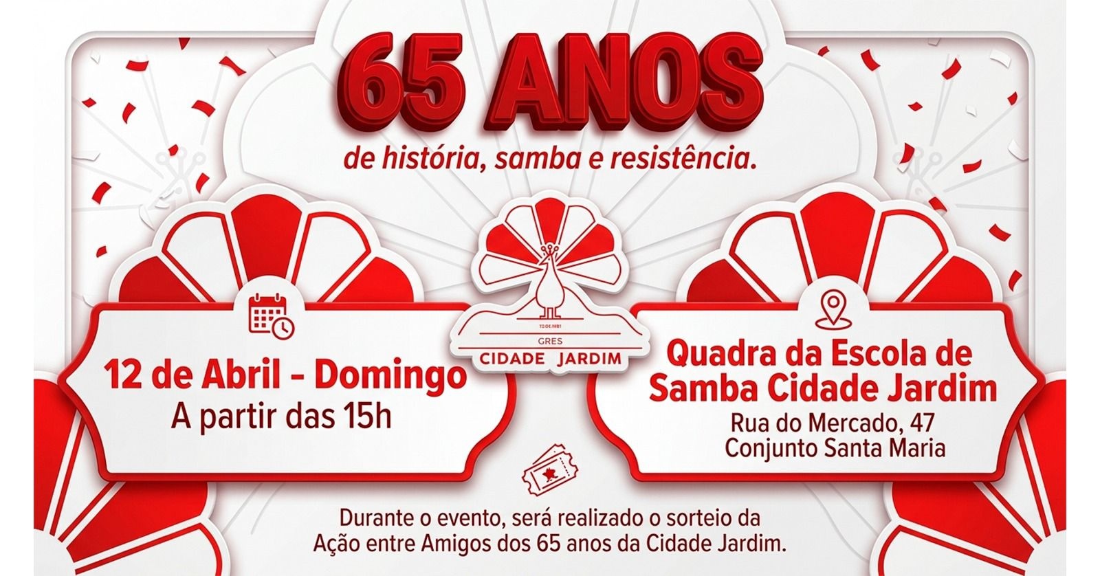 O Grêmio Recreativo Escola de Samba Cidade Jardim (G.R.E.S Cidade Jardim) convida você para viver um momento histórico: a celebração dos seus 65 anos de vida, luta e samba.