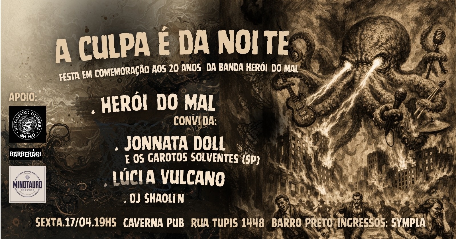 Neste sentido, estaremos promovendo uma grande festa com a volta do Herói do Mal aos palcos revisitando temas clássicos e novidades de seu repertório, incluindo o novo single "A Culpa é da Noite" e como convidados especiais estamos trazendo dois expoentes da musica independente de BH e SP: Lucia Vulcano(BH) e Jonnata Doll e os Garotos Solventes(SP) e para animar a noite contaremos com a presença do DJ Shao Lin comandando as pick-ups.