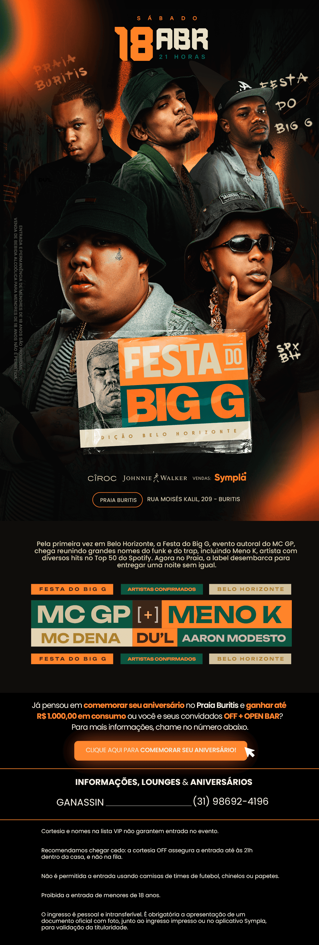 Resenha do Vaguinho Prepare-se para viver uma experiência diferente de tudo que você já viu. Não é apenas um evento — é uma verdadeira resenha. Imagine só: • Chopp liberado (100L garantidos — quanto mais cedo chegar, melhor aproveita) • Churrasco liberado (diversos tipos de carnes) • Entrada permitida com cooler (com a bebida de sua preferência) Não é permitido reabastecimento via aplicativos nem saída com retorno • Piscina liberada • Pagode ao vivo daquele jeito que a gente gosta • Venda de drinks no local Tudo isso em um ambiente pensado para quem gosta de música boa, bebida gelada e zero preocupação. A proposta é simples: Chegue com os amigos, curta sem pressa e vá embora apenas com boas histórias para contar. Se você gosta de pagode, churrasco e uma resenha de verdade… esse evento não é uma opção — é presença confirmada. INFORMAÇÕES IMPORTANTES • OBRIGATÓRIA A APRESENTAÇÃO DE DOCUMENTO OFICIAL COM FOTO (FÍSICO OU DIGITAL) • PERMITIDA A ENTRADA DE COOLER COM BEBIDA DE SUA PREFERÊNCIA • SAÍDA SEM RETORNO • PROIBIDO O REABASTECIMENTO DE COOLER ATRAVÉS DE APLICATIVOS • PERMITIDA A ENTRADA DE MENORES SOMENTE ACOMPANHADOS DOS RESPONSÁVEIS • NÃO TOLERAMOS QUALQUER TIPO DE DISCRIMINAÇÃO, ASSÉDIO OU COMPORTAMENTO INADEQUADO • AO PARTICIPAR DO EVENTO, VOCÊ CONCORDA COM A POLÍTICA DE IMAGEM E USO DE FOTOS/VÍDEOS +INFO: (31) 9 9480-0356 – VAGUINHO (31) 9935-0627 – SAMMY