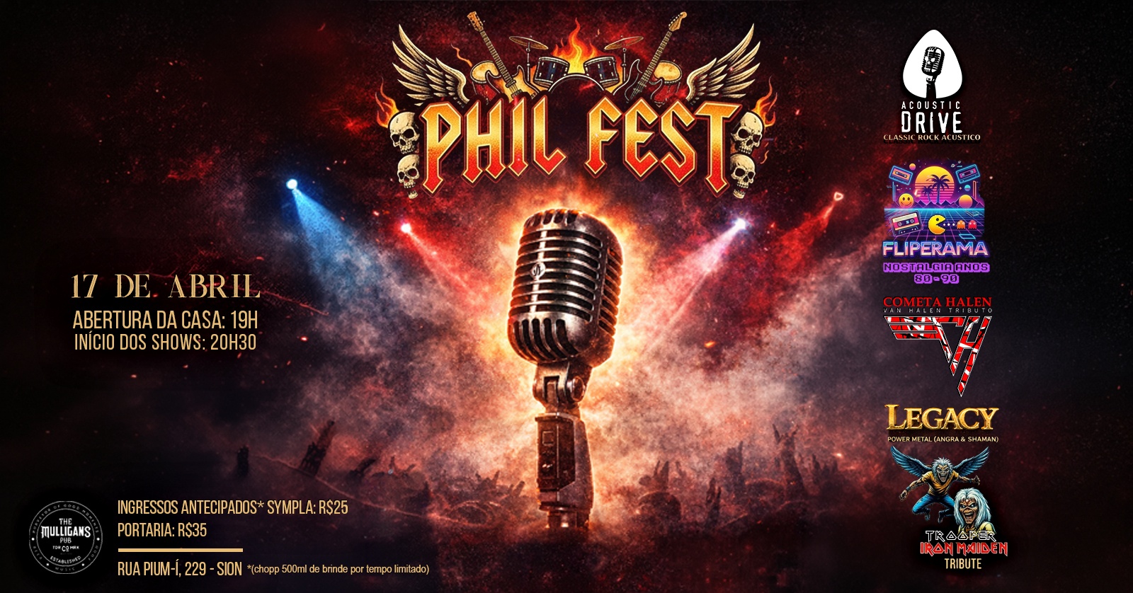 Prepare os ouvidos e o coração! No dia 17 de abril, o Mulligans Pub será o palco de uma noite histórica para celebrar o aniversário de 42 anos de Phil Lima. Reunimos um line-up de peso que atravessa gerações do Rock, desde os clássicos acústicos até o poder do Heavy Metal.