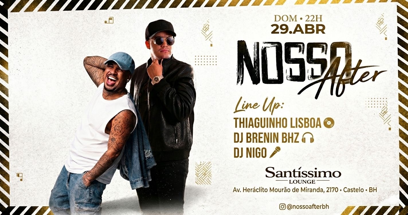 Dia 29/04 (domingo) a partir das 22h, o Santíssimo Lounge recebe mais uma edição do Nosso After com muito pagode e funk, energia lá em cima e aquela vibe que só quem cola sabe!