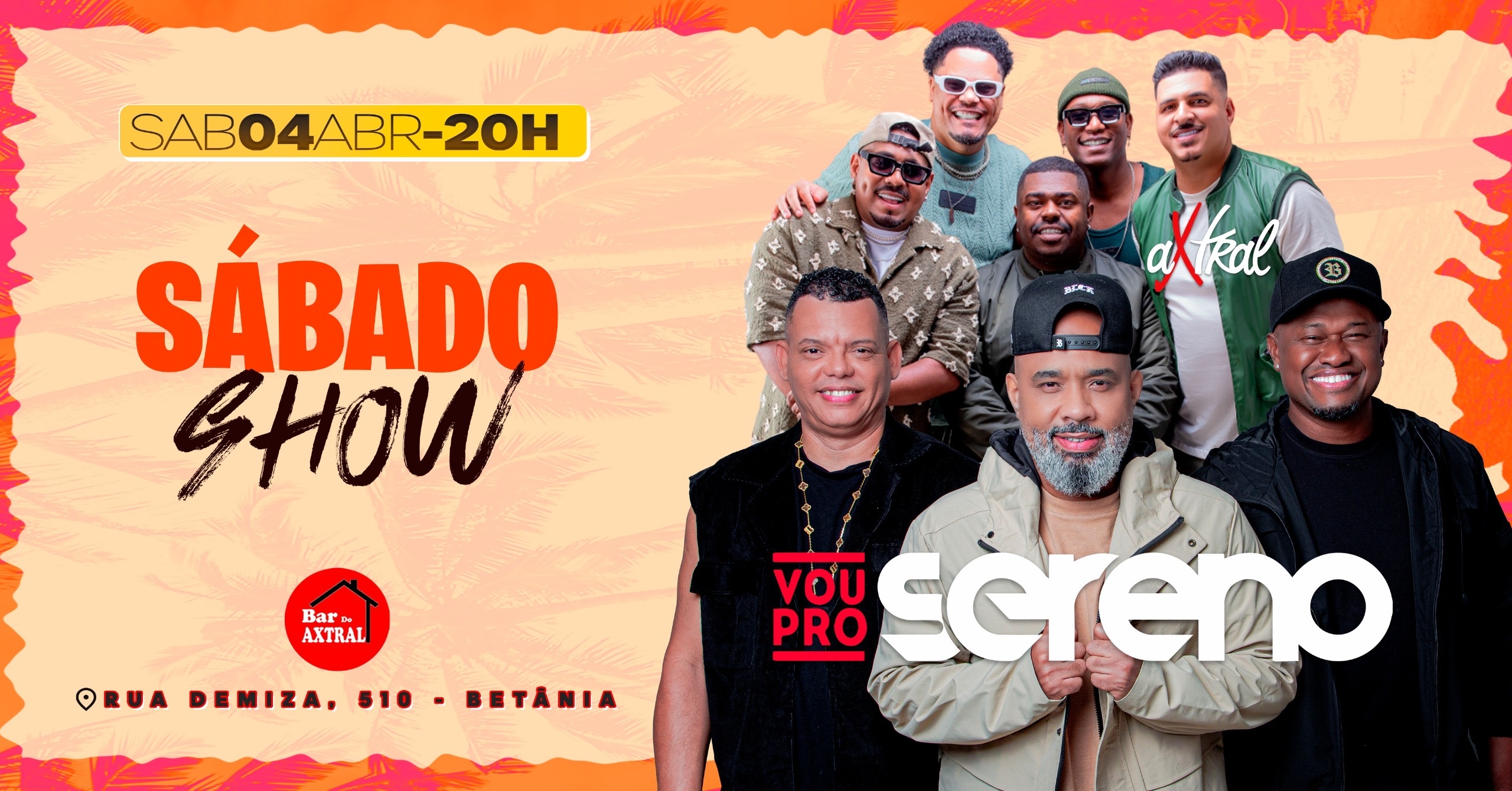Diretamente do Rio de Janeiro VOU PRO SERENO, cantando seus maiores sucessos no Bar do Axtral, não fique de fora dessa festa garanta seu ingresso e vem curtir com a gente!!