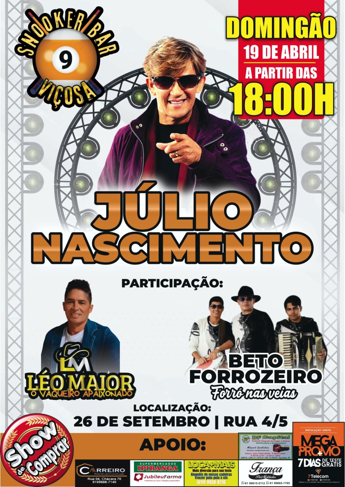 Pela primeira vez no snooker Bar viçosa, Júlio nascimento como atração principal. Teremos participação de beto forrozeiro e leio maior como nossa abertura. O local terá segurança para revistar e seguimentos padrão, a loja fica localizada na 26 de setembro rua 4/5.