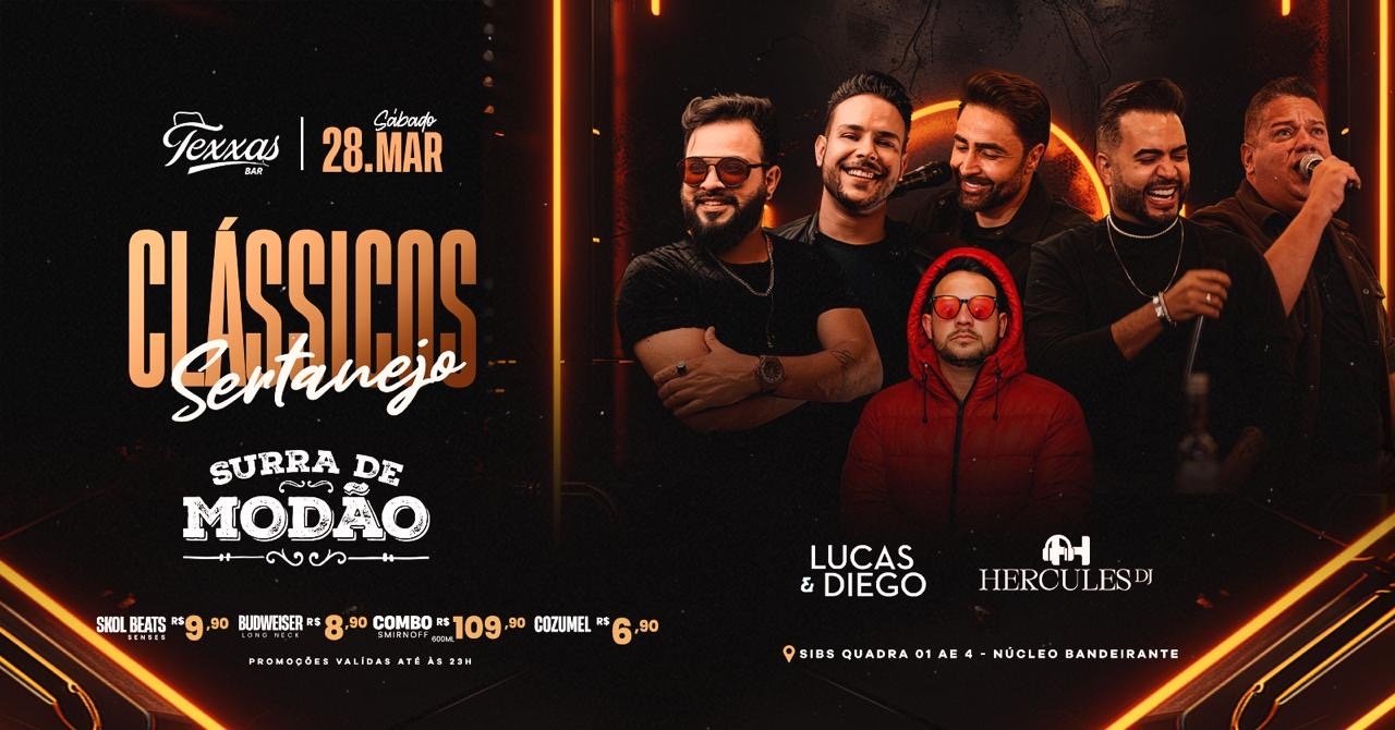 TEXXAS BAR | SÁBADO - SURRA DE MODÃO - CLÁSSICOS SERTANEJO + LUCAS e DIEGO + DJ HÉRCULES | 28 mar 2026
