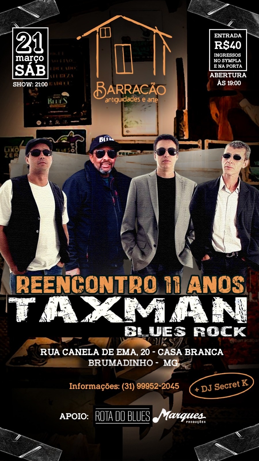 Thunder Blues no Barracão Antiguidades e Arte Prepare-se para uma noite especial que reúne música, arte e gastronomia em um dos espaços mais charmosos da região. No dia 27 de março, o Barracão Antiguidades e Arte recebe a Thunder Blues para um show intenso e envolvente, com interpretações marcantes de clássicos do blues, soul e rock. A casa abre às 19h, oferecendo uma experiência gastronômica especial assinada pela chef Juju Gastrô, com o melhor da gastronomia autoral. A noite também contará com o chopp artesanal da Cervejaria Bebrum, trazendo alguns dos melhores rótulos da região para acompanhar essa experiência. O show da Thunder Blues começa às 20h30, em um ambiente perfeito para quem aprecia boa música, boa comida e bons encontros. Informações do Evento Data: 27 de março Abertura da casa: 19h Show Thunder Blues: 20h30 DJ Secret K Local: Barracão Antiguidades e Arte Rua Canela de Ema, 20 - Casa Branca – Brumadinho/ MG Ingressos: R$ 40,00 Ingressos disponíveis antecipadamente pelo Sympla e também à venda na porta no dia do evento (sujeito à disponibilidade). Garanta o seu lugar e venha viver essa experiência.