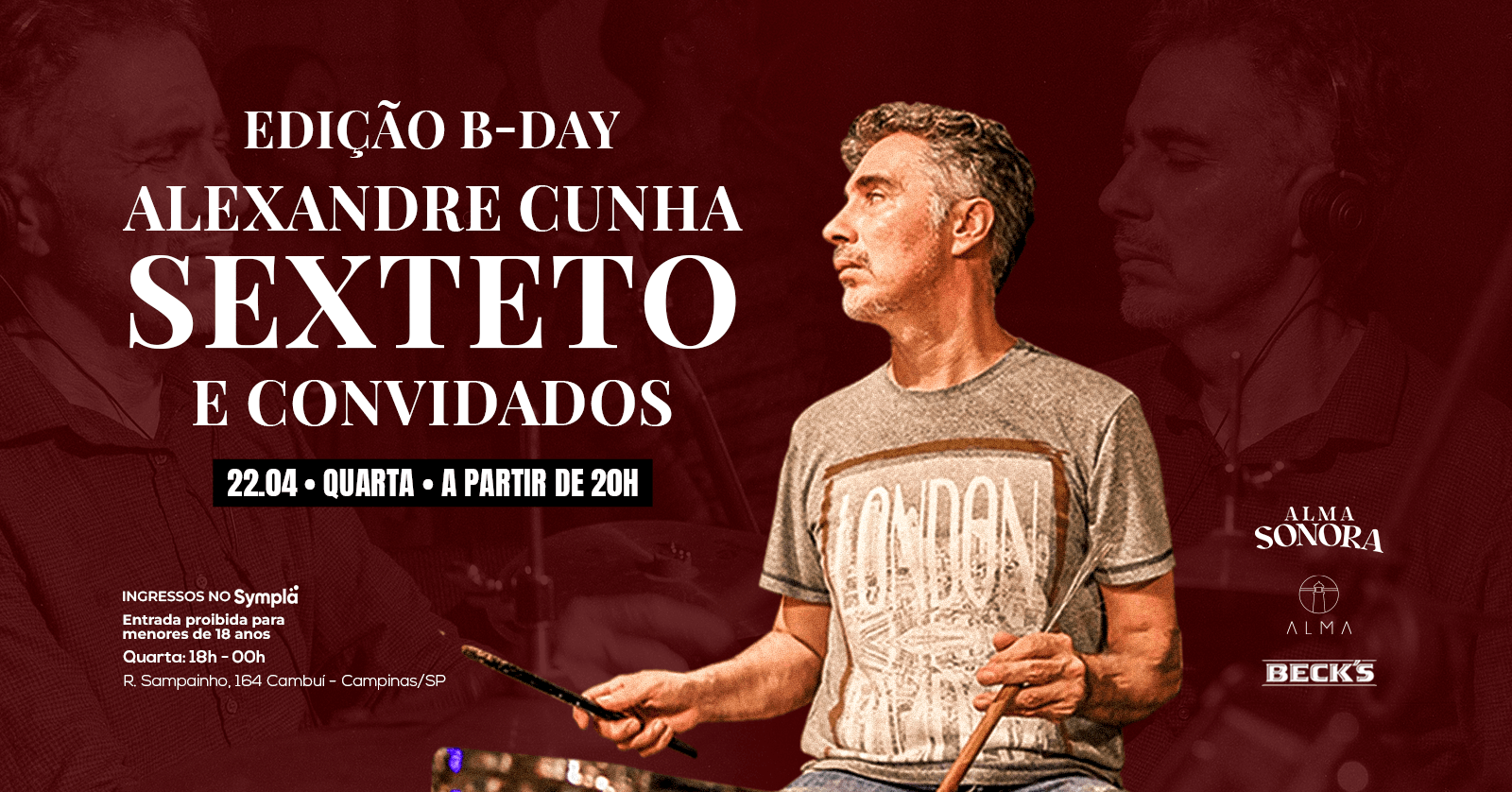 O baterista Alexandre Cunha (@alexandre_cunha_drummer) celebra seu aniversário no palco do Alma Campinas, em formato de sexteto, Uma festa musical que recebe convidados especiais no dia 22 de abril, na quarta-feira.
