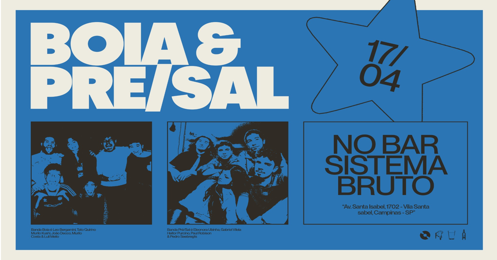 As bandas Boia e Pré/Sal te convidam para uma noite mais que especial no Bar Sistema Bruto, repleta de música boa e lindas amizades, ó que top ein!