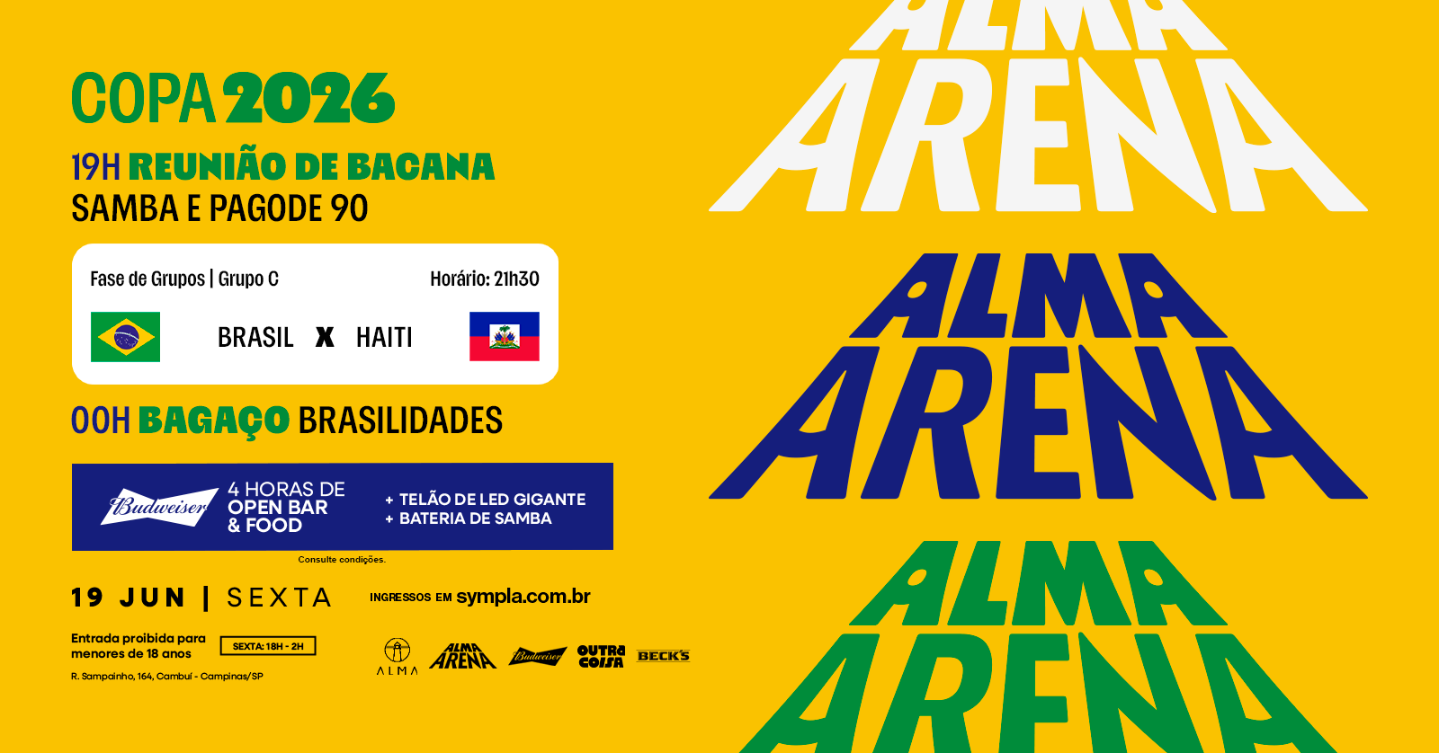 Quarta-feira também é dia de Brasil! E quando é o último jogo da fase de grupos, a emoção vem ainda mais forte. No dia 24 de junho, o Alma Arena entra no clima da Copa com telão de LED gigante e bateria de samba marcando o ritmo da torcida na nossa arquibancada A festa começa mais cedo: às 17h, o Reunião de Bacana (@reuniaodebacana) chega com o melhor do pagode 90 e do samba, só sucessos pra esquentar o clima antes da bola rolar. Às 19h, é hora de Brasil entrar em campo contra a Escócia, no último duelo da fase de grupos. E depois do jogo, a energia continua lá em cima. Às 21h, a banda Tequila Brasileira assume com um especial cheio de hits de Paralamas do Sucesso e Skank, daqueles que a gente revive muitos hits brasileiros. Pra completar a experiência, são 4 horas de open bar e open food, que começa 2 horas antes do jogo até o final da partida. No open bar: Budweiser, Bud Zero, água e guaraná. E Open Food à la estádio: lanche de pernil, cachorro quente, salgadinho, pipoca, amendoim e batata chips. Durante o jogo: Open de GT & Outra Coisa! Convida os amigos e vem curtir a Copa do Mundo no Alma Arena! 24.06, quarta-feira, 17h Alma Campinas R. Sampainho, 164 Cambuí, Campinas – SP O ingresso não garante lugares sentados - mesas por ordem de chegada. Proibida a entrada de menores de 18 anos de idade. Abertura da casa: 16h.