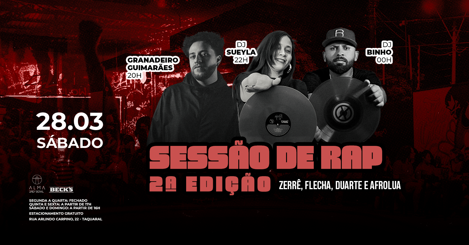 Entre os convidados da noite, teremos Zerrê (@zerre.pontaoeste), Afrolua (@afroolua), Flecha (@flecha.alqm) e Duarte (@du019arte).