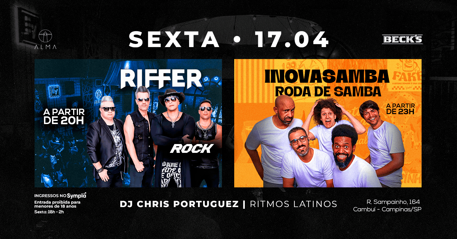 A sexta-feira, 17 de abril, no Alma Campinas vai ser uma viagem de ritmos, do rock ao samba, uma mistura de gêneros pra a nossa noite quente.