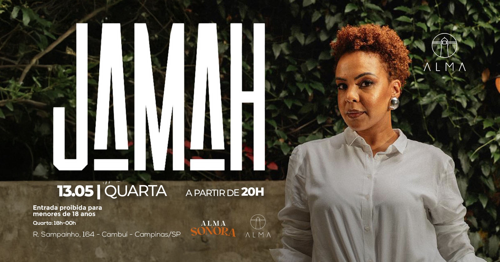 No dia 13 de maio, quarta-feira, o Alma Campinas recebe a cantora Jamah (@jamahmusic) em uma noite que passeia a soul, o R&B, a black music e a MPB com muita intensidade.