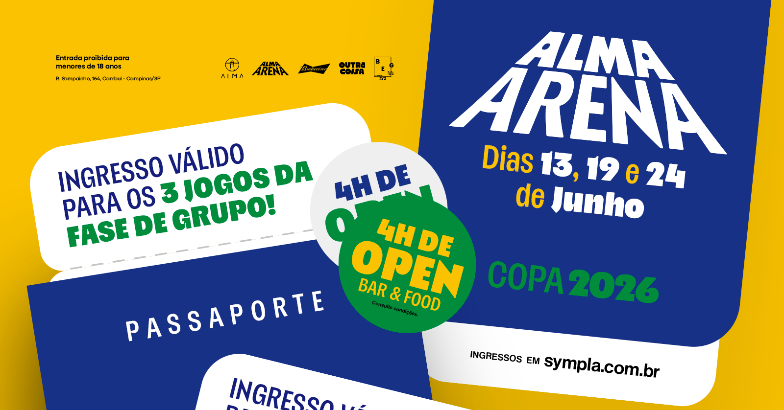 Quarta-feira também é dia de Brasil! E quando é o último jogo da fase de grupos, a emoção vem ainda mais forte. No dia 24 de junho, o Alma Arena entra no clima da Copa com telão de LED gigante e bateria de samba marcando o ritmo da torcida na nossa arquibancada A festa começa mais cedo: às 17h, o Reunião de Bacana (@reuniaodebacana) chega com o melhor do pagode 90 e do samba, só sucessos pra esquentar o clima antes da bola rolar. Às 19h, é hora de Brasil entrar em campo contra a Escócia, no último duelo da fase de grupos. E depois do jogo, a energia continua lá em cima. Às 21h, a banda Tequila Brasileira assume com um especial cheio de hits de Paralamas do Sucesso e Skank, daqueles que a gente revive muitos hits brasileiros. Pra completar a experiência, são 4 horas de open bar e open food, que começa 2 horas antes do jogo até o final da partida. No open bar: Budweiser, Bud Zero, água e guaraná. E Open Food à la estádio: lanche de pernil, cachorro quente, salgadinho, pipoca, amendoim e batata chips. Durante o jogo: Open de GT & Outra Coisa! Convida os amigos e vem curtir a Copa do Mundo no Alma Arena! 24.06, quarta-feira, 17h Alma Campinas R. Sampainho, 164 Cambuí, Campinas – SP O ingresso não garante lugares sentados - mesas por ordem de chegada. Proibida a entrada de menores de 18 anos de idade. Abertura da casa: 16h.