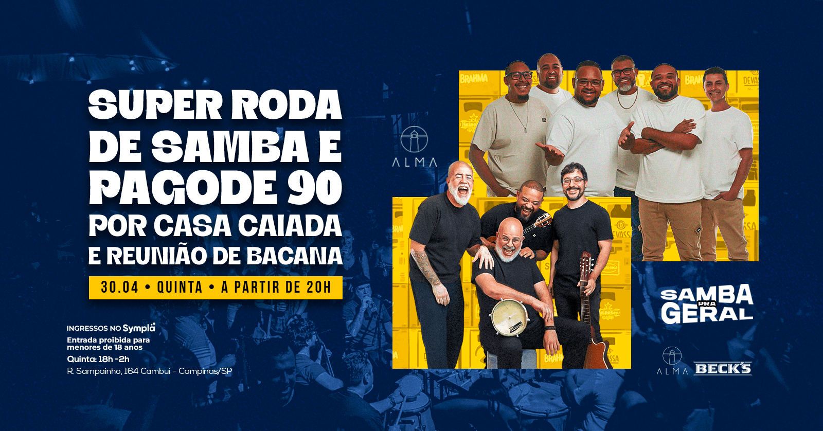 Se prepara pra cantar alto, reviver os sucessos que todo mundo sabe de cor e fechar abril com a melhor energia possível aqui no Alma. Vem pro Samba Pra Geral!