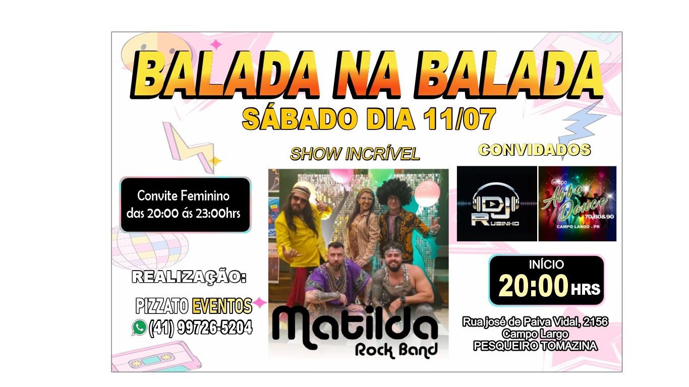 \Churras show 22/08/2026\ Nossa Edição já esta no ar... Venda será no Sympla!! Início 12h e término as 2h Nosso espaço é cheio de verde, natureza e conta com estrutura para camping (descoberto), chuveiros e banheiros para atender a cada um de vocês com todo conforto necessário durante o evento. \Camping R$ 20 adicional ao valor do ingresso\ \Open Cooler\ (traga sua bebida) Vamos ter comidinhas além do churras e bebidas á venda no local, então não precisa se preocupar! ATRAÇÕES CONFIRMADAS ! Trio Potigua Nando do acordeon + Feeh Silva + Flavinho Lima Duka Santos e os meninos do Grove DJS DJ Naty DJ Robson DJ MUMU (PR) Endereço Rodovia Raul Azevedo de Macedo, 2333, Salgadinho, campo largo- PR (Chácara da Helo) Informações 41 99181-5622 (Sergio) NO DIA DO EVENTO, VAI ROLAR SORTEIO, DE 10 quick massagem com a Fran da sinestesia !!! Alguns Avisos da Casa Bebidas levem o que forem consumir Teremos Também bebidas a venda Levem seus coolers se levar bebida Levem seus copos Churrasco carne Vermelha carne porco linguiça Baião de 2 - Chef Lucélia Buffet de saladas Não perde tempo e vem fazer parte desta festa incrível que esta sendo preparada com muito carinho e amor pra receber cada um de vocês!