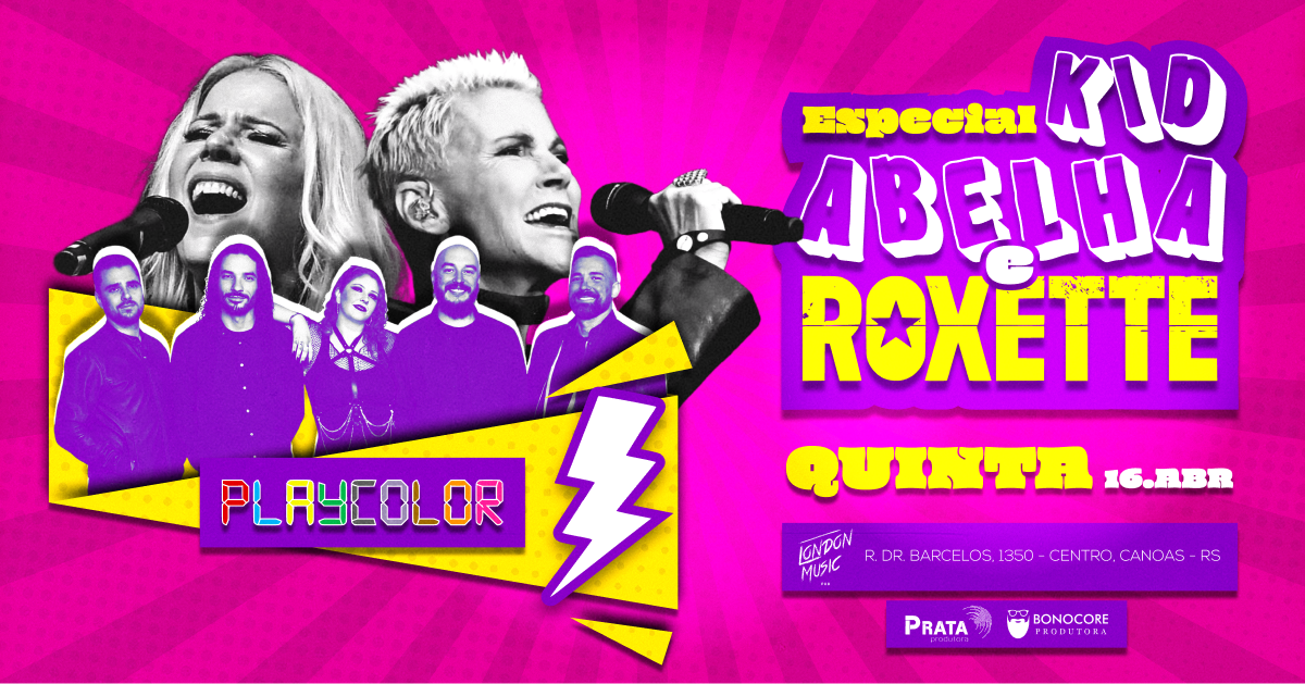 Pela primeira vez no London em Canoas, a banda PLAYCOLOR de Porto Alegre, traz seu especial ROXETTE + KID ABELHA, recheado de sucessos e nostalgia, na voz marcante da vocalista EVA QUADROS. Uma noite imperdível.
