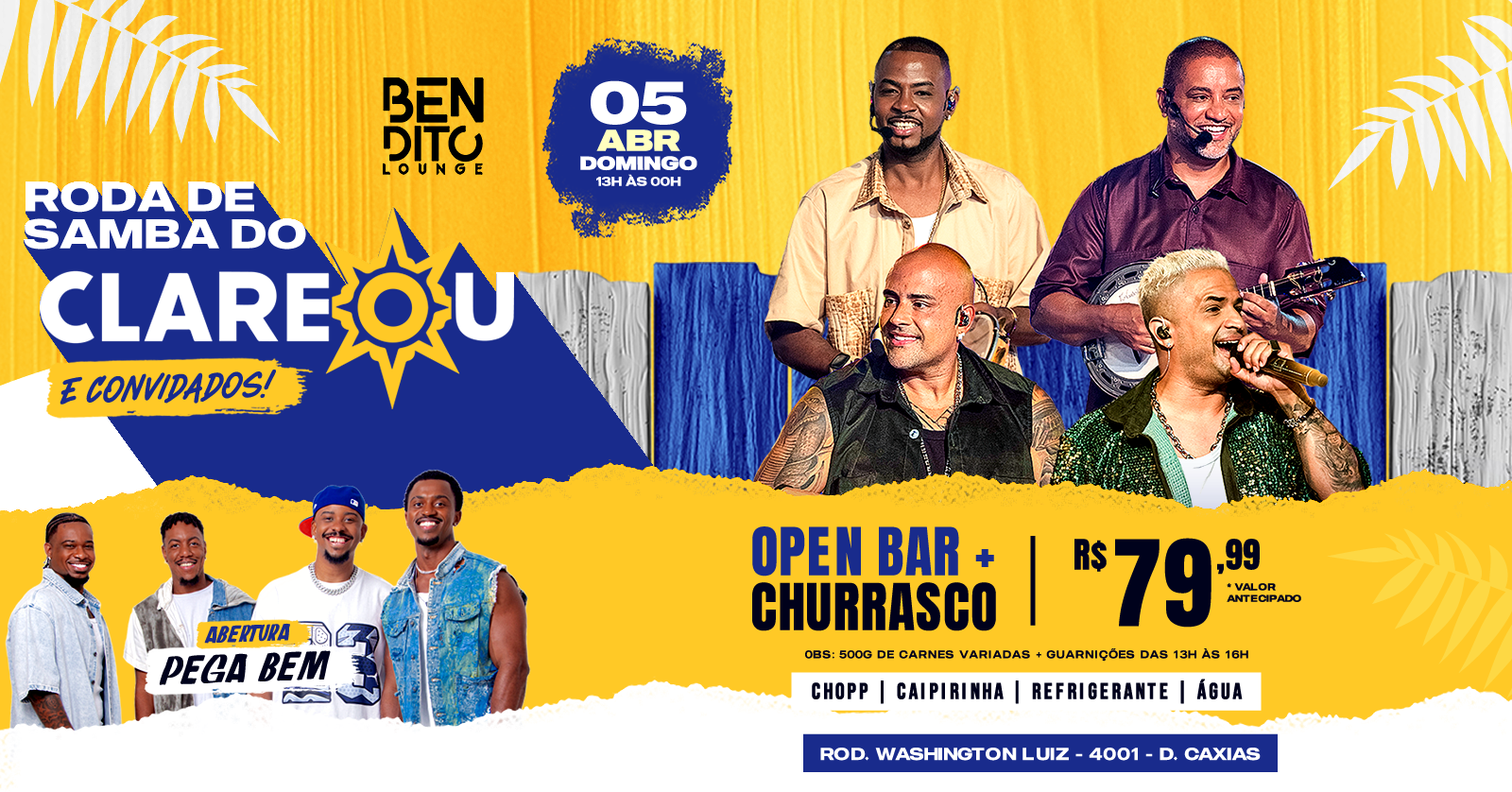 A Roda De Samba Mais Esperada Do Momento, RODA DE SAMBA DO CLAREOU e convidados, o grupo Clareou vai comemorar os 15 anos da sua roda de samba no palco do Bendito , é isso mesmo, todos os domingos de março tem CLAREOU no melhor Domingo do mundo sempre com um convidado especial. Vamos juntos curtir essa tarde e noite de muito samba e pagode?? E a ainda, CHURRASKADA + OPEN BAR, CHURRASCO servindo 500g de carnes variadas POR PESSOA + GUARNIÇÕES. e mais OPEN BAR de Chopp, água , caipirinha e refrigerante das 13h as 16h. funcionamento da casa e ate as 00h Ingressos sem open bar e sem churrasco só entram no evento após as 16h, mediante lotação da casa. ATENÇÃO; Aniversariantes e convidados deverão comprar os ingressos da churrascada antecipado, para garantirem a promoção de aniversário.