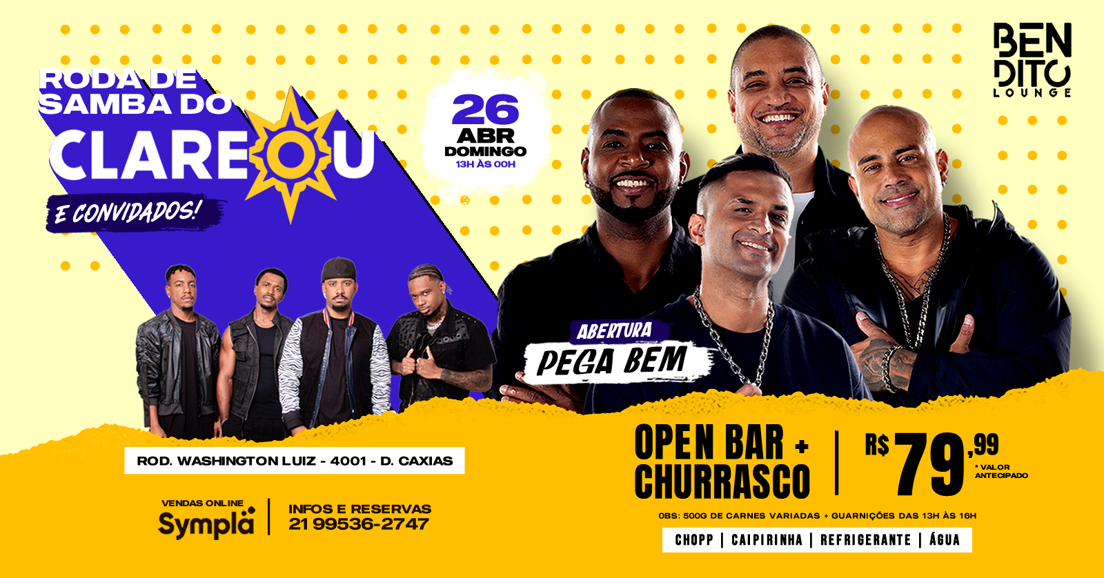 Samba bom e feijoada, é no Bendito! A feijoada com OPEN BAR mais famosa de todo o rio e baixada recebe o Cantor BELELEU e o cantor BRAGA para mais uma tarde e noite de samba especial. E MAIS... Open Food de Feijoada das 13h as 16h. Open bar das 13h as 16h. Ingressos promocionais após as 16h. mediante lotação da casa. ATENÇÃO; Aniversariantes e convidados deverão comprar os ingressos antecipados, para garantir os benefícios. Encerramento 00h Informações 21 99536-2747 Obs: Nos Reservamos o direto de corrigir qualquer erro de digitação.