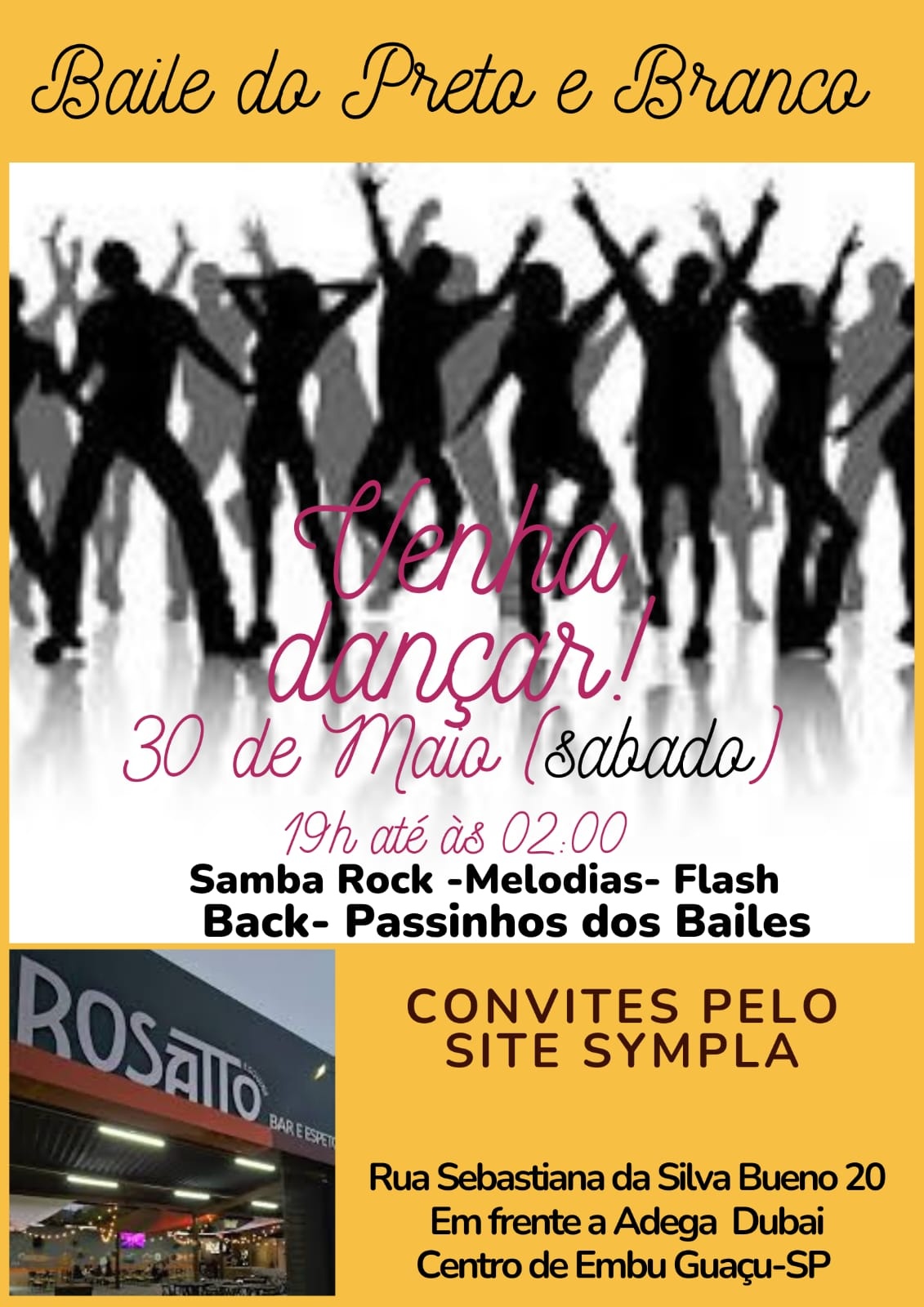 1° Festa do Preto e Branco no Espaço Rosatto situado em Embu Guaçu local ambiente agradavel com comidas e bebidas e aquele Choop Gelado para o deleite dos Clientes . Dia 30 de Maio (Sabado) teremos o melhor das epocas dos Grandes Bailes com o melhor da Old Shool passando pelo era da Discoteca aquela seleção de Melodias , Samba Rock e os passinhos da galera dos Bailes . Traje Esporte Fino camisetas, chinelos e camisas de times não sera permitida a entrada . não sera vendido INGRESSOS NA PORTARIA somente pelo Site ate as 18:00 do dia do EVENTO dia 30 de MAIO. Venha se divertir vc e nosso convidado ( a)