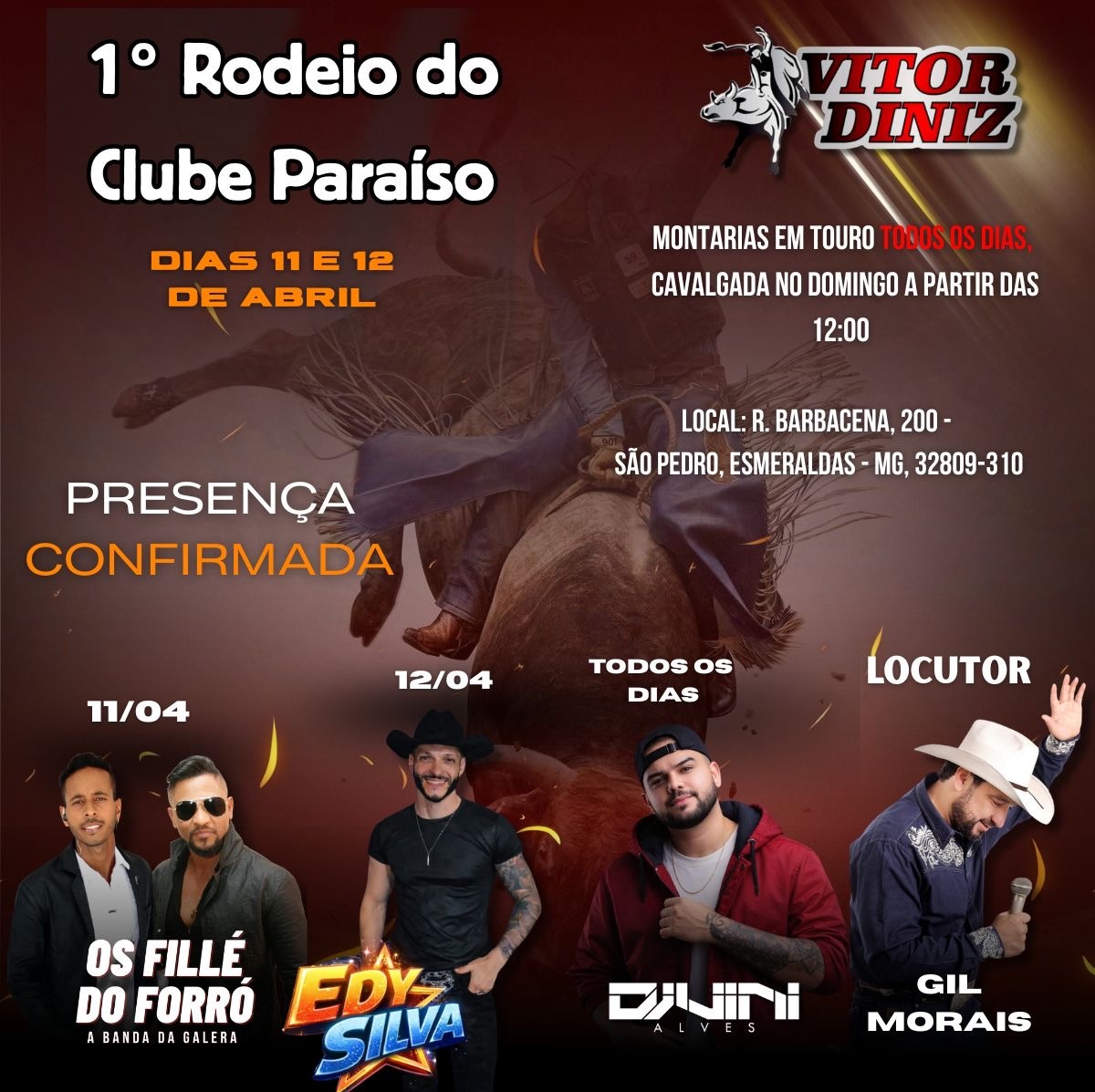 O 1º Rodeio do Clube Paraíso promete muita animação, emoção na arena e um ambiente preparado com praça de alimentação, bebidas e muita música boa.