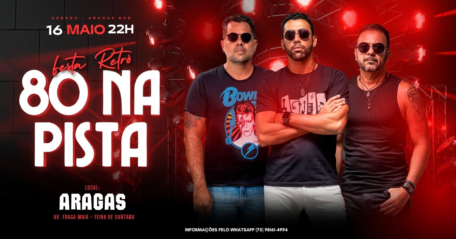 No dia 16 de maio de 2026, a partir das 21h, o ARAGAS, em Feira de Santana, será palco de uma verdadeira viagem no tempo com a incrível Banda 80 na Pista, trazendo ao vivo os hits mais marcantes dos anos 80.