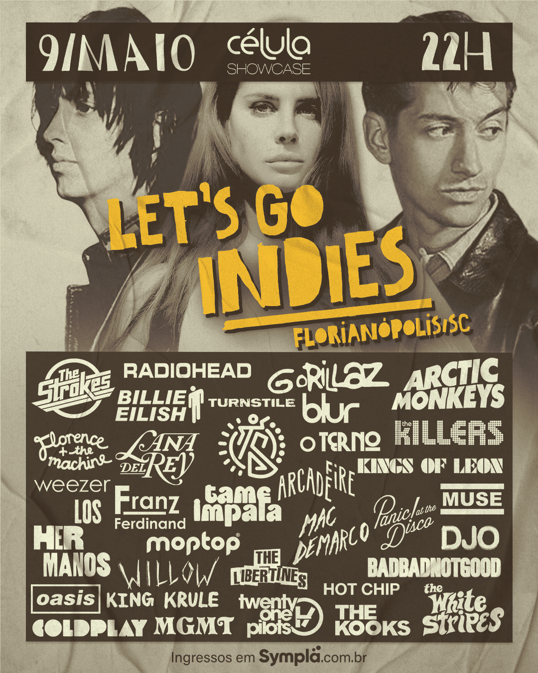 Arctic Monkeys • The Strokes • Kings of Leon • Weezer • Turnstile • Queens of The Stone Age • Coldplay • White Stripes • Two Door Cinema Club • Moptop • Banda do Mar • Radiohead • The Killers • Franz Ferdinand • Lana Del Rey • Hot Chip • Mac DeMarco • MGMT • Talking Heads • Blur • Supergrass • Oasis • David Bowie • Tame Impala • Beirut • Keane • Florence + The Machine • Vampire Weekend • The Drums • Muse • The Flaming Lips • Spoon • Jet • Arcade Fire • King Krule • Julian Casablancas • Phoenix • Yeah Yeah Yeahs e muito mais!