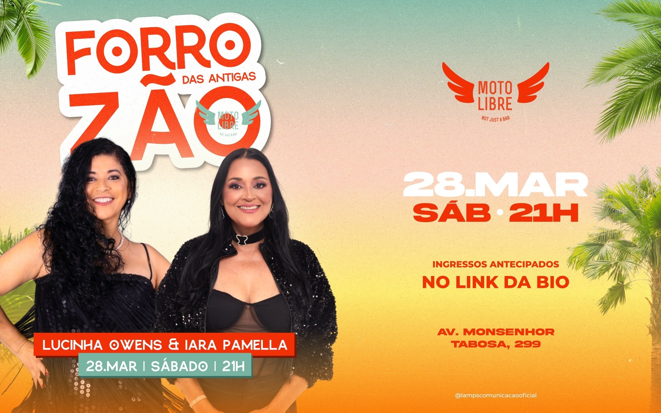 A partir das 21h, Lucinha Owens chega trazendo aquele repertório que bate na memória de qualquer forrozeiro raiz. na sequência, Iara Pamella assume o palco mantendo o baile cheio daqueles clássico do forró.