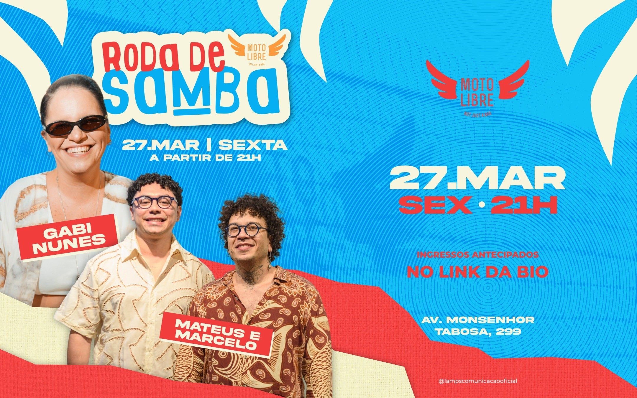 No primeiro tempo, Mateus e Marcelo começam o som com aquele samba cheio de romantismo malemolente que vocês já conhecem, né!? Logo mais, Gabi Nunes entra mantendo a roda viva com muita cantoria e axé até às 3 da matina.