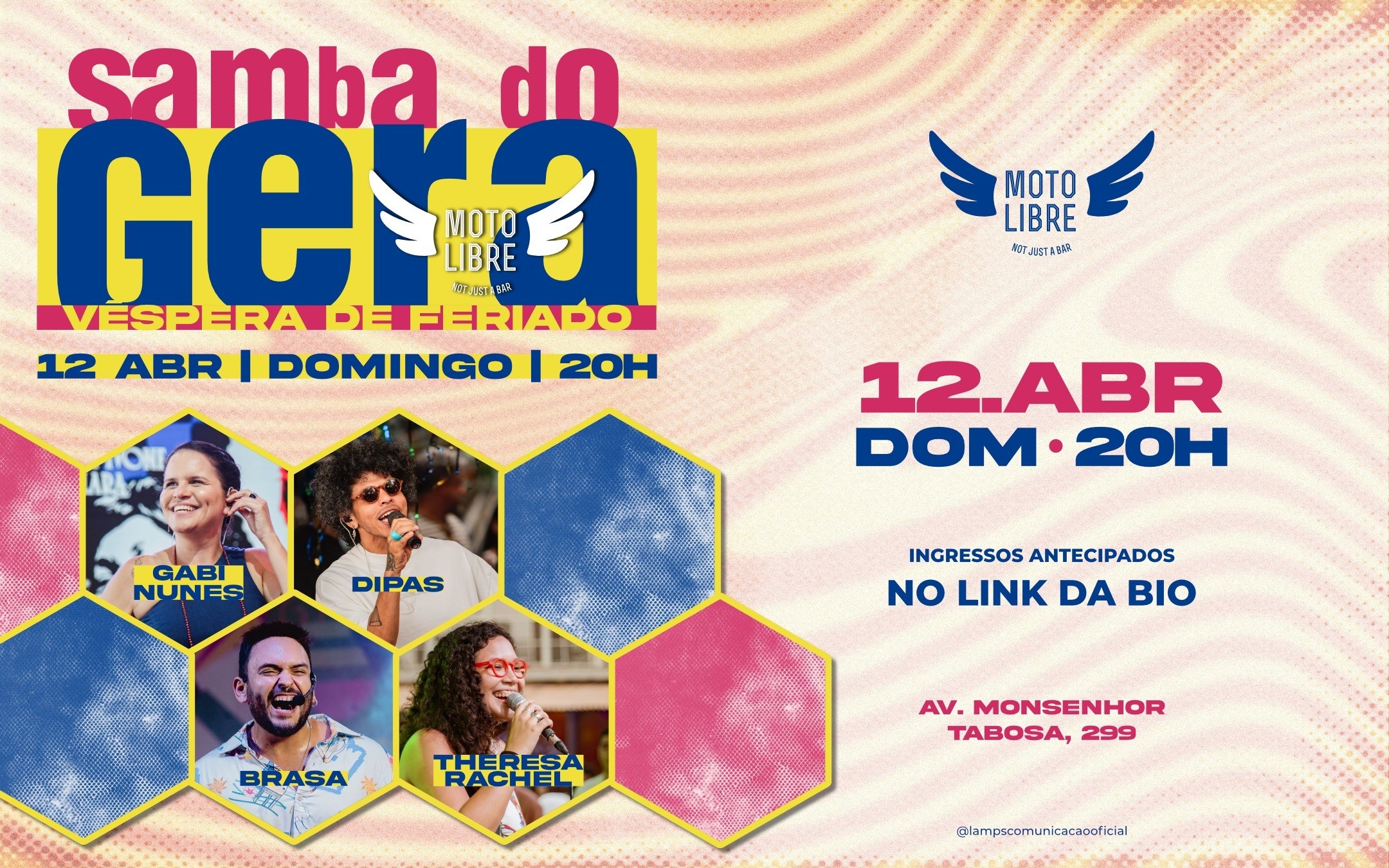 Domingo (12/04), véspera de feriado, a partir das 20h, Gabi Nunes, Brasa, Dipas e Theresa Rachel se encontram pra fazer o samba girar bonito e fechar a semana com aquela energia que a gente já conhece.