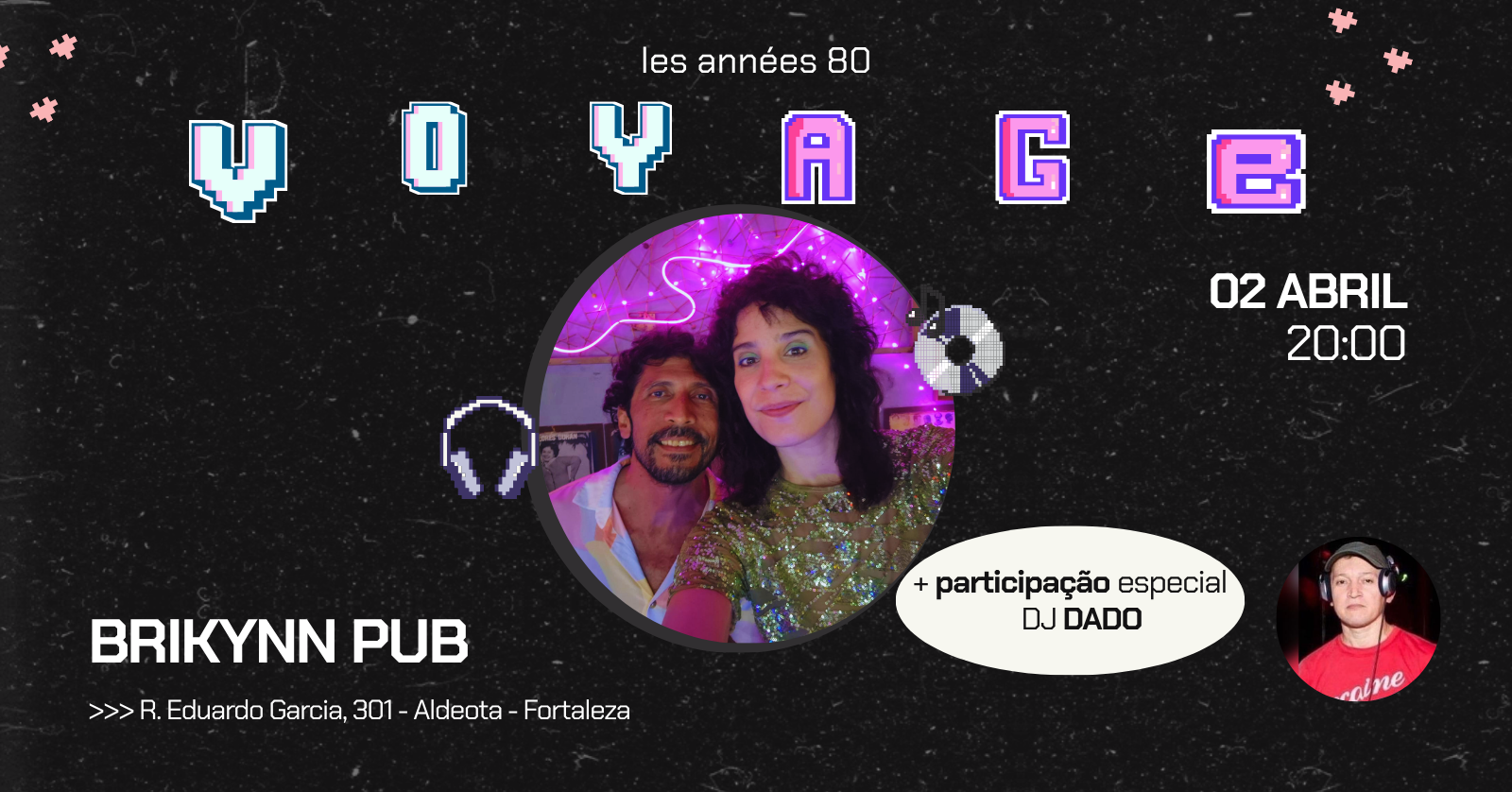 VOYAGE retorna ao palco do BRIKYNN para mais uma noite que vai agitar a pistinha rock mais quente da aldeota. E dessa vez a dupla de djs maarji e Estácio Facó recebem o ícone da discotecagem Indie, dj Dado (nOise3d, Festa fliperama etc).
