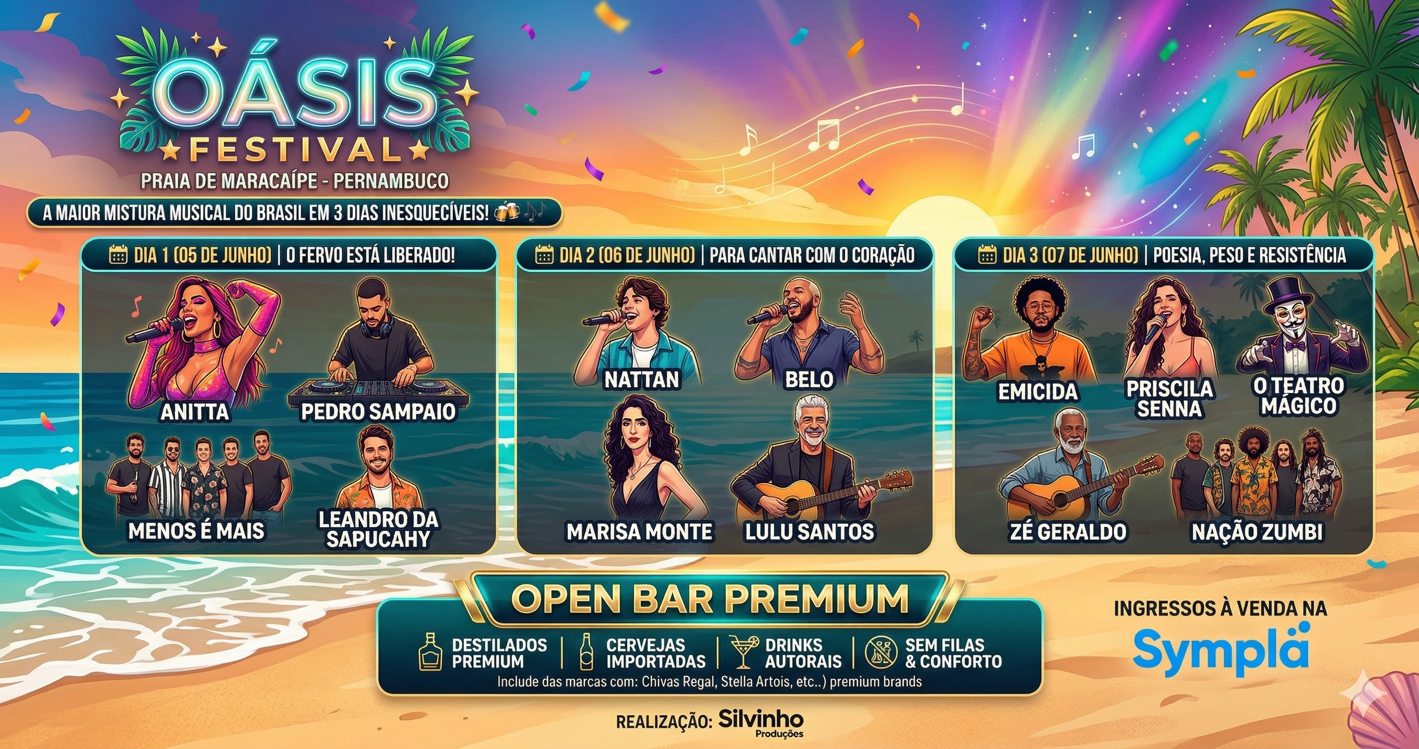 Prepare-se para viver a experiência mais intensa e plural do ano. Nos dias 5, 6 e 7 de junho, nosso encontro está marcado para uma maratona musical épica, onde os maiores nomes da música brasileira se encontram no mesmo palco. Tudo isso com um Open Bar Premium do começo ao fim, para você curtir cada segundo sem preocupações!