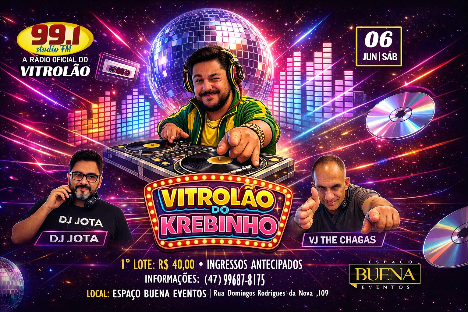 O Vitrolão do Krebinho chega com tudo para te levar direto aos melhores momentos das décadas de 80, 90 e 2000, em um evento pensado para quem ama reviver os grandes sucessos que marcaram época.