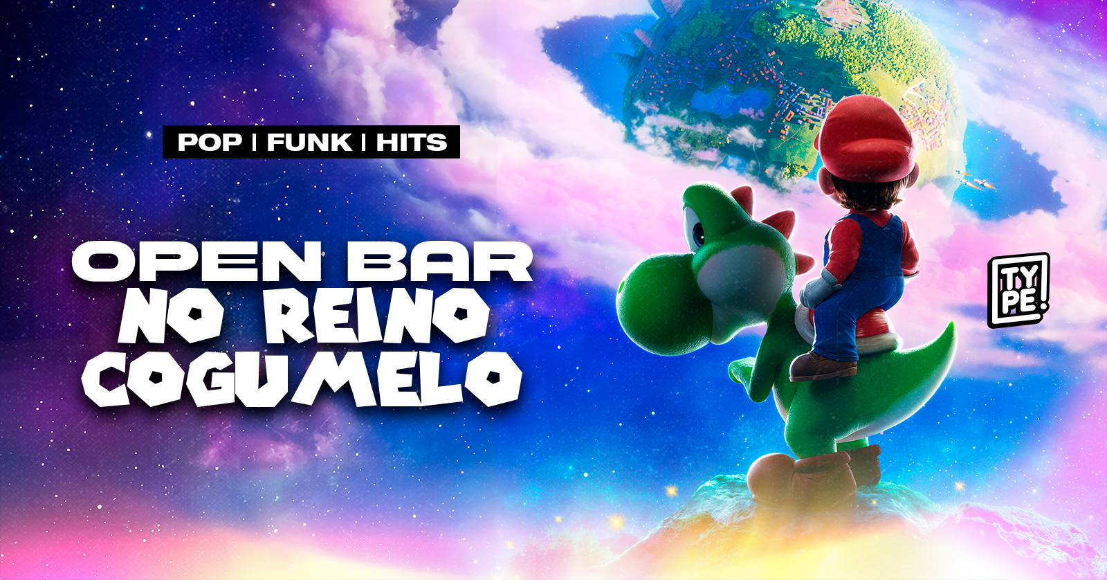 Pulando de galáxia em galáxia, existe uma inteirinha que Mario, Luigi, Rosalina, Bowser e Yoshi ainda não exploraram. E ela fica dentro da TYPE, te esperando pra um open bar no Reino Cogumelo.