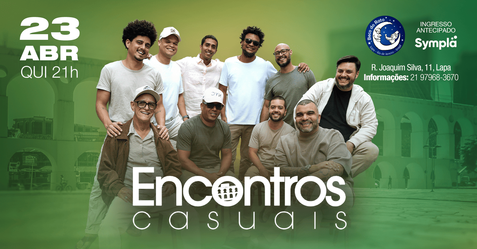 ENCONTROS CASUAIS - INÁCIO RIOS & MOSQUITO Data: 09/04/2025 Local: Beco do Rato Endereço: Rua Joaquim Silva, 11, Lapa Abertura da casa: 18h A partir de 21h, o samba come solto. Nos intervalos, a DJ Cris Panttoja já coloca todo mundo pra da Roda de Samba: 21h00 Evento sujeito à lotação. EVENTO SUJEITO A LOTAÇÃO