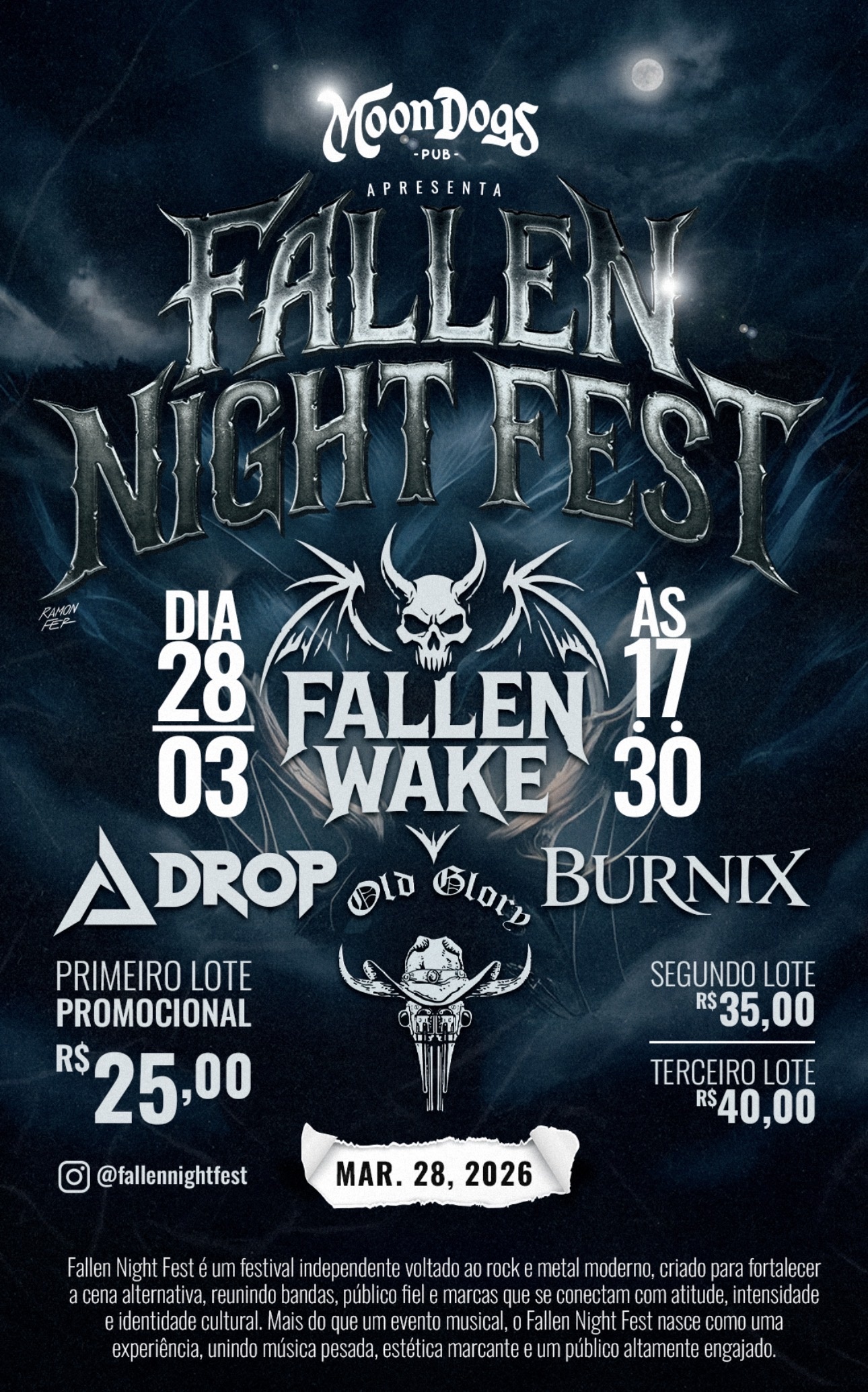 Fallen Night Fest é um festival independente voltado ao rock e metal moderno, criado para fortalecer a cena alternativa, reunindo bandas, público fiel e marcas que se conectam com atitude, intensidade e identidade cultural. Mais do que um evento musical, o Fallen Night Fest nasce como uma experiência, unindo música pesada, estética marcante e um público altamente engajado.