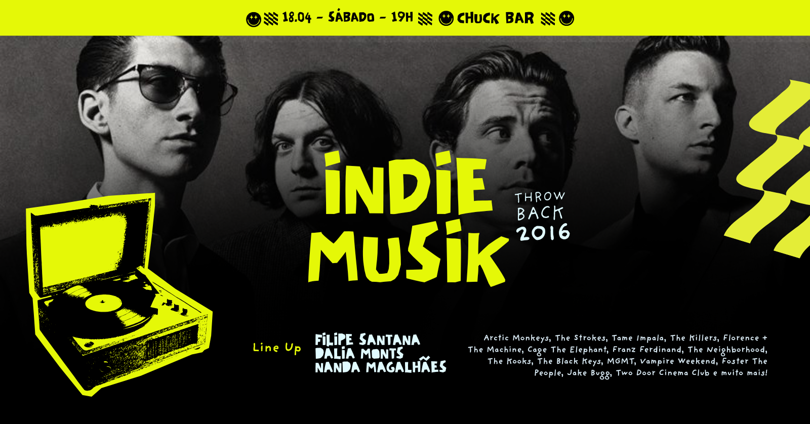 Prepare-se para uma viagem no tempo com o melhor do Indie e do Pop que marcou uma geração. No dia 18 de Abril, o Chuck Bar abre as portas para revivermos a era de ouro das guitarras e dos sintetizadores.