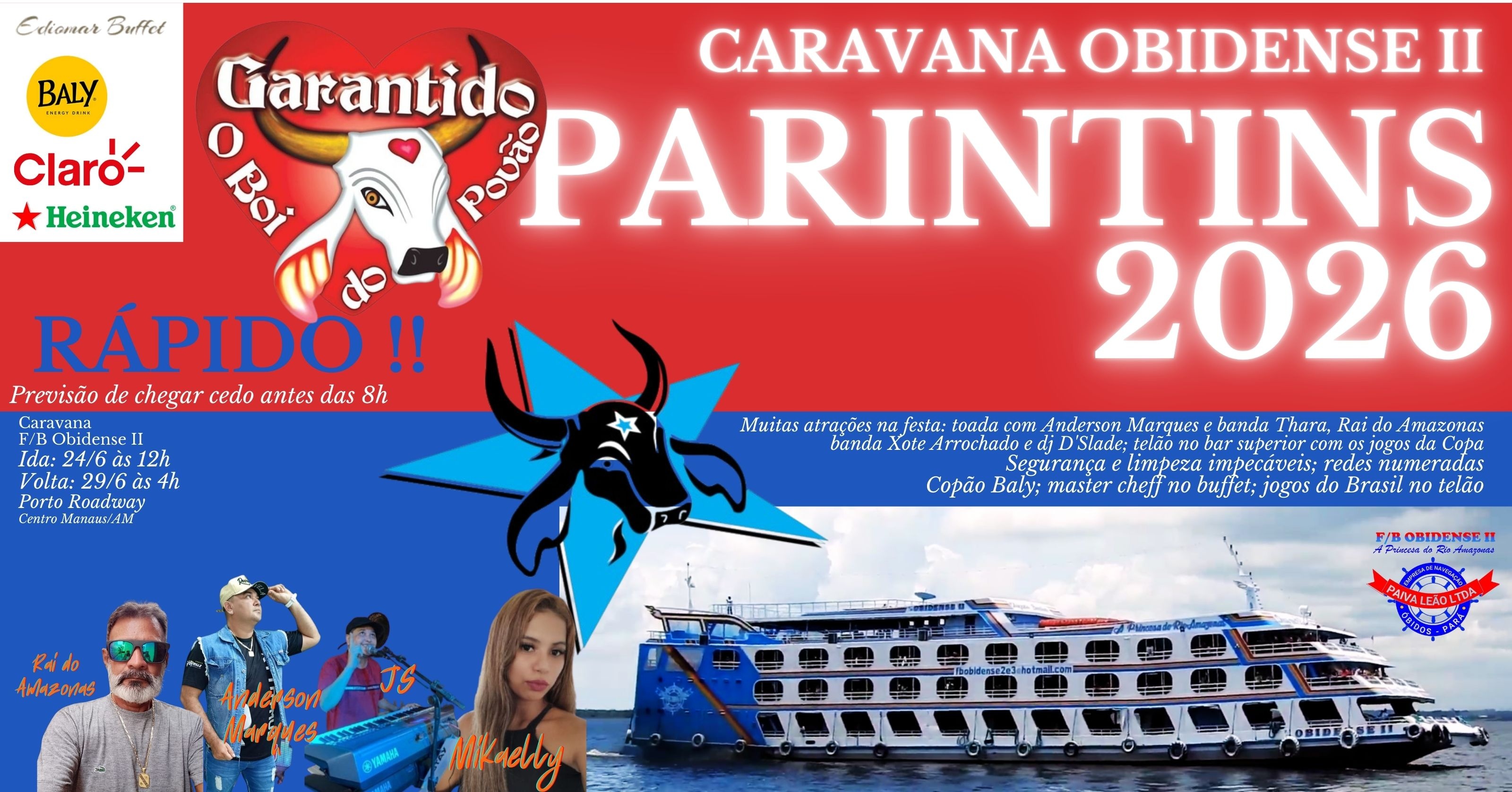 A CaravanaFerryboat Obidense IIacompanhará o Festival de Boi-bumbá de Parintins, com saída de Manaus na quarta-feira, dia 24 de junho (12h) e retorno após o término do festival (29 de julho, 3h - segunda-feira - de Parintins). Será a ÚNICA caravana rápida, com previsão de chegada entre 6 e 8h da manhã dia 25 de junho.