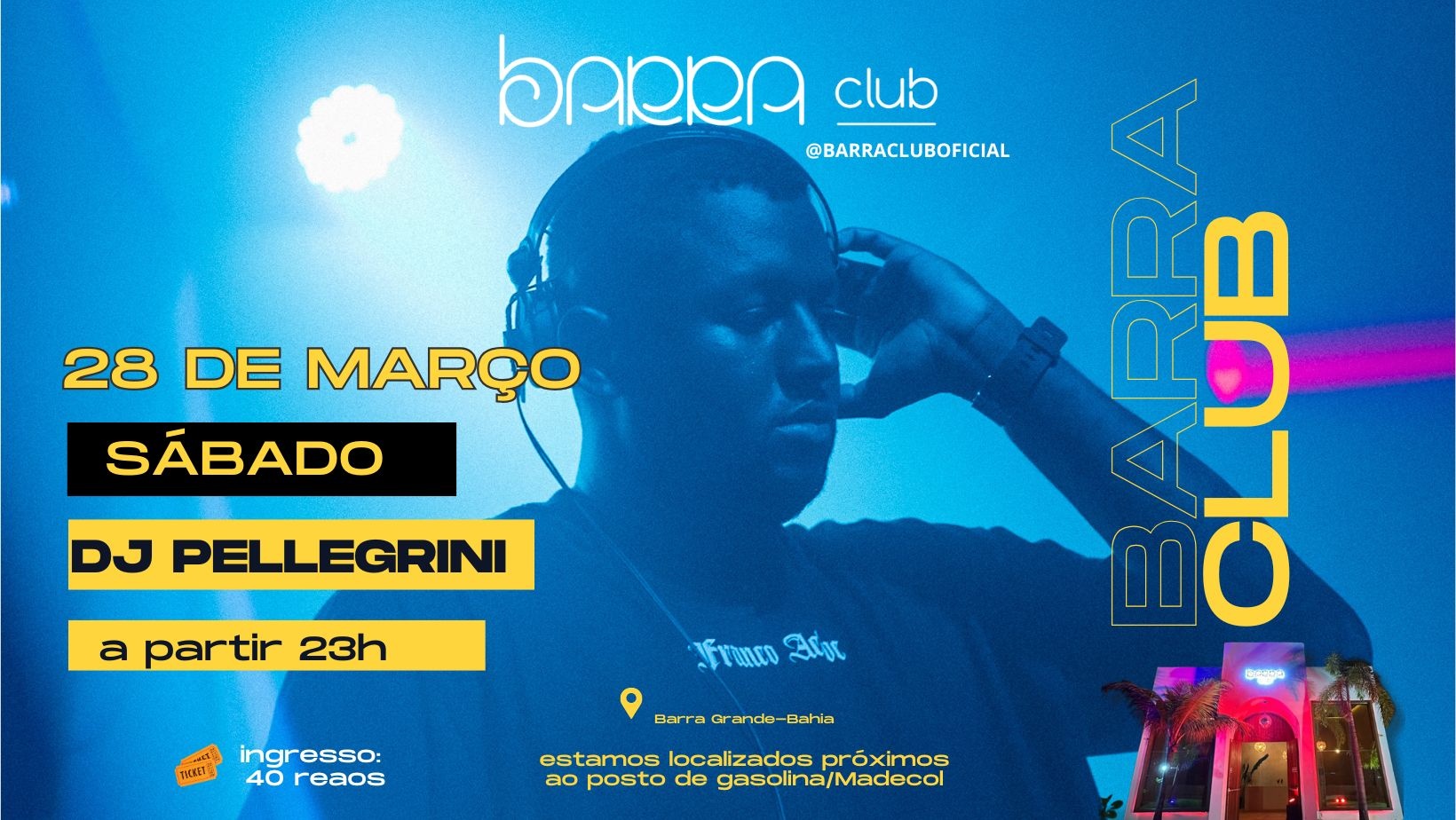 Dia 28 de março, a partir das 23h, o Barra Club recebe DJ Pellegrini comandando a pista com os hits mais tocados do momento.