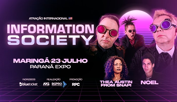 A atração principal será a lendária banda americana Information Society, referência mundial do synth-pop e da música eletrônica dos anos 80 e 90. O grupo conquistou fãs em todo o planeta com hits que dominaram rádios e pistas de dança, especialmente o clássico “What’s on Your Mind (Pure Energy)”, que se tornou um verdadeiro hino da cultura pop e da música eletrônica.
