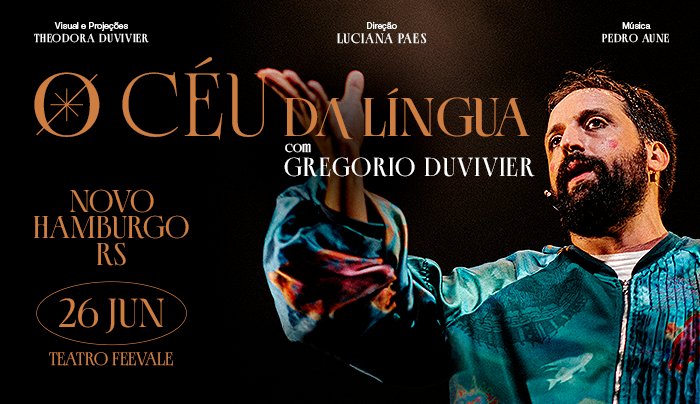 Dirigido por Luciana Paes, o espetáculo “O Céu da Língua”, estrelado por Gregorio Duvivier, chega a Novo Hamburgo dia 26 de junho, no Teatro Feevale.