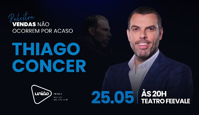No dia 25 de maio, às 20h, no Teatro Feevale, a Rádio União e Grupo Krause apresentam: Thiago Concer, o maior especialista em vendas do Brasil, com mais de 22 anos de experiência no mercado. Autor best-seller e referência nacional, ele vai mostrar, na prática, por que vendas não acontecem por acaso — e como você pode assumir o controle dos seus resultados.