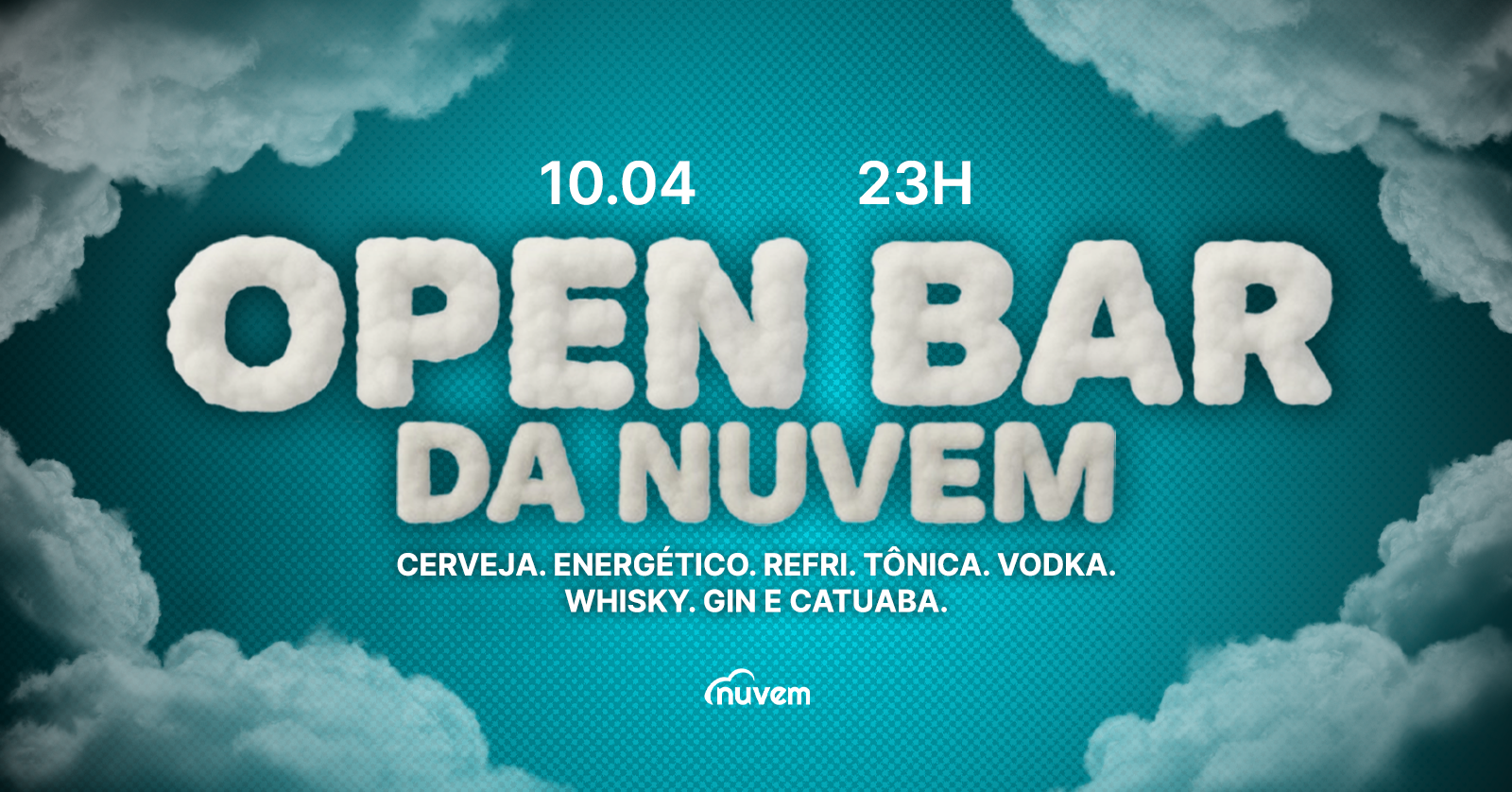 OPEN BAR DE ENERGÉTICO, CERVEJA, REFRI, TÔNICA, ÁGUA, VODKA, WHISKY, GIN E CATUABA.