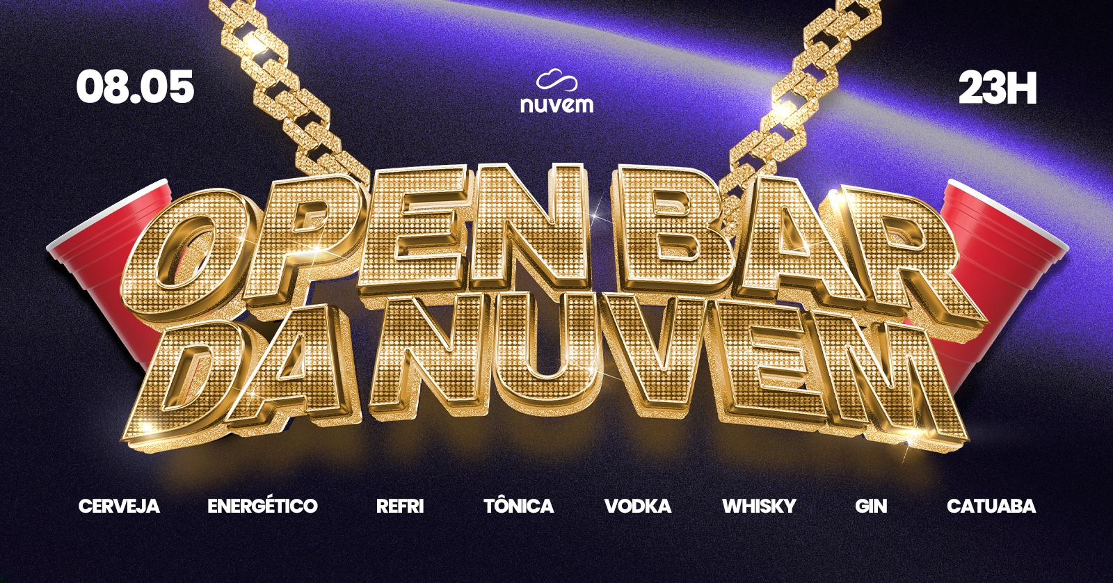 OPEN BAR DE ENERGÉTICO, CERVEJA, REFRI, TÔNICA, ÁGUA, VODKA, WHISKY, GIN E CATUABA.
